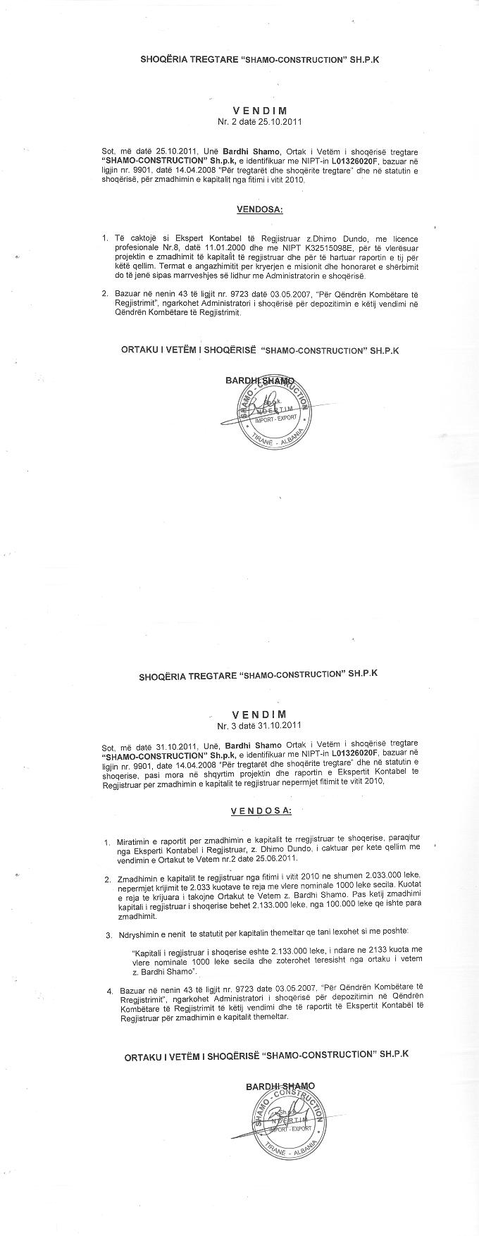 → Ekstrakt historik i regjistrit tregtar 12.05.2022 → Statuti i shoqerise → Vendim i asamblese se ortakeve per miratimin e zmadhimit te kapitalit 31.10.2011 → Ekstrakti Historik i Regjistrit Tregtar date 26.04.2024 |