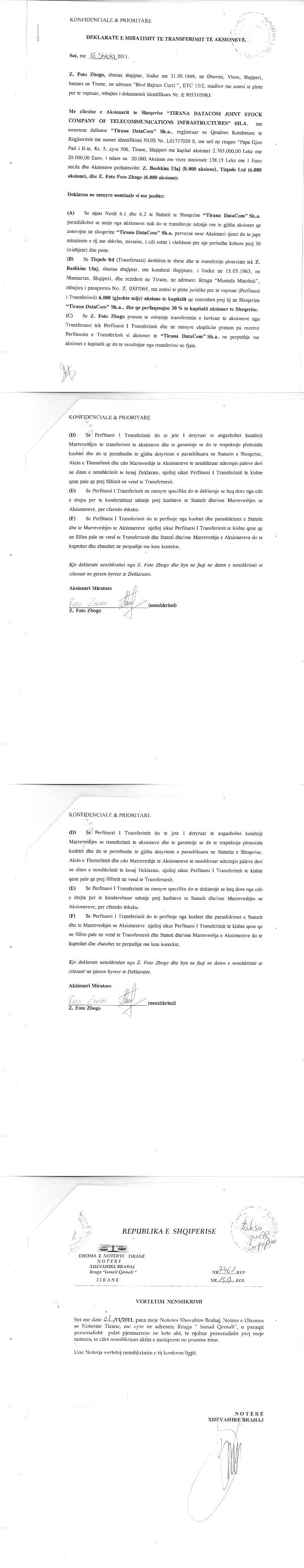 | Parent Company / Owner: | "GENER 2", shoqëri me përgjegjësi te kufizuar e se drejtës shqiptare, themeluar me date 06/07/2003 me NUIS K58615301M me seli qendrore ne Tirane, Njesia administrative nr.2, Rruga "Papa Gjon Pali II", Ndertesa nr 12, ABA Business Center 1010 dhe me administrator Artila Ulaj; Bashkim Ulaj. Ortaket e shoqerise jane Bashkim Ulaj me 34% te kapitalit; Ahmet Ulaj dhe Astrit Ulaj me 33% te kapitalit secili. (Sipas te dhenave te QKB deri me date 03.06.2023) Sipas Ekstraktit Historik te Regjistrit te Pronarit Perfitues, date 11.03.2021 terhequr nga QKB date 03.06.2023, Pronaret perfitues te subjektit “TIRANA DATACOM”, zoterues te 25% te kapitalit e me teper, janë: Foto Zbogo, shtetas shqiptar, i datelindjes 1949, pronar perfitues per 30% të kapitalit. Data e përcaktimit si pronar perfitues eshte 21.09.2010. Ahmet Ulaj, shtetas shqiptar, i datelindjes 1951, pronar perfitues per 23.10% te kapitalit, pasi zotëron 33% të kapitalit të shoqërisë “GENER 2” shpk, dhe kjo e fundit zotëron 70% të kapitalit të shoqërisë “TIRANA DATACOM”. Data e percaktimit si pronar perfitues eshte 07.09.2015. Bashkim Ulaj, shtetas shqiptar, i datelindjes 1951, pronar perfitues per 23.80% te kapitalit, pasi zotëron 34% të kapitalit të shoqërisë “GENER 2” shpk, dhe kjo e fundit zotëron 70% të kapitalit të shoqërisë “TIRANA DATACOM”. Data e percaktimit si pronar perfitues eshte 07.09.2015. Astrit Ulaj, shtetas shqiptar, i datelindjes 1951, pronar perfitues per 23.10% te kapitalit, pasi zotëron 33% të kapitalit të shoqërisë “GENER 2” shpk, dhe kjo e fundit zotëron 70% të kapitalit të shoqërisë “TIRANA DATACOM”. Data e percaktimit si pronar perfitues eshte 07.09.2015. |