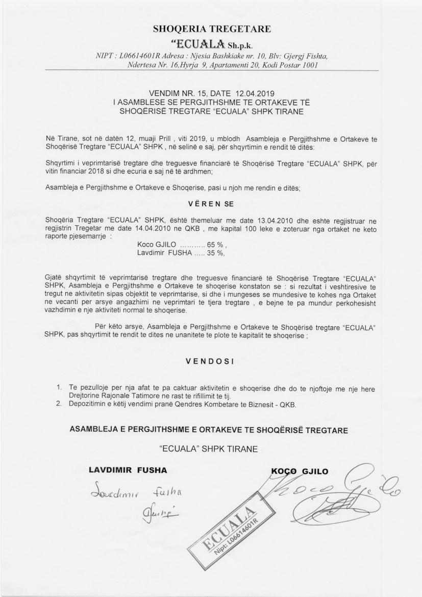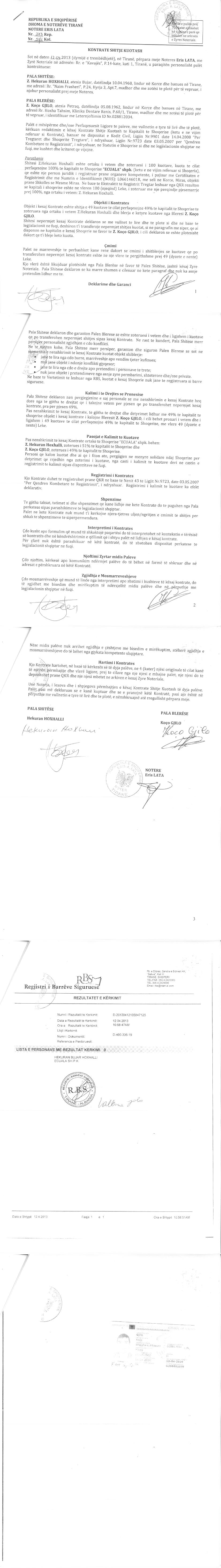 → Ekstrakt historik i regjistrit tregtar 09.04.2024 → Kontrate shitblerje kuotash 11.01.2017 → Kontrate shitje kuotash 02.10.2013 → Kontrate shitje kuotash 12.04.2013 → Kerkese per aktivizim aktiviteti 03.10.2012 → Kerkese per pezullim te aktivitetit 15.12.2010 → Vendim i asamblese se ortakeve per pezullim te aktivitetit 12.04.2019 |