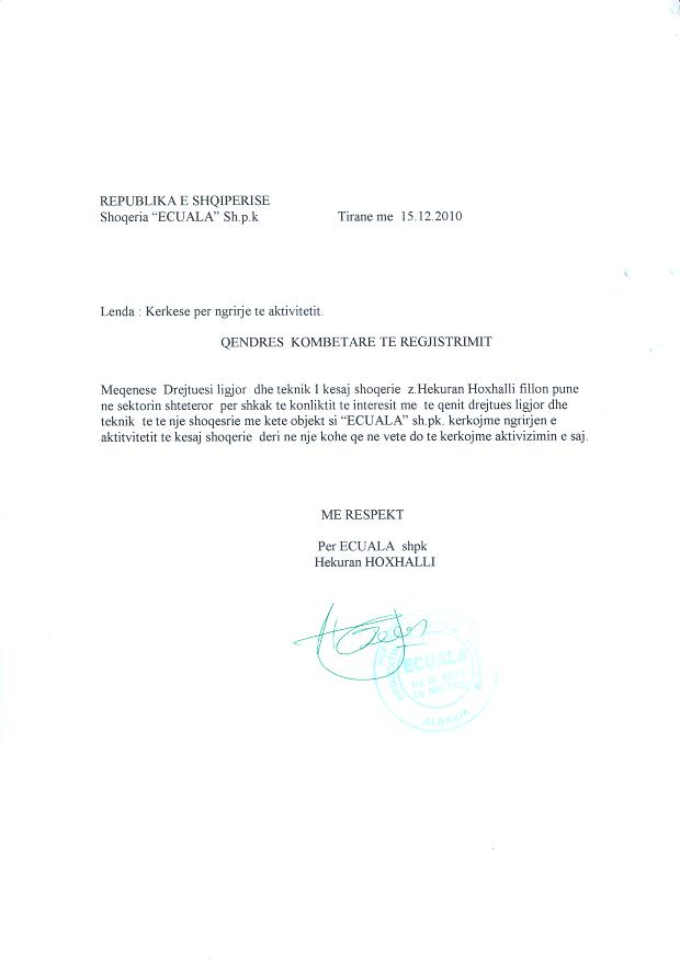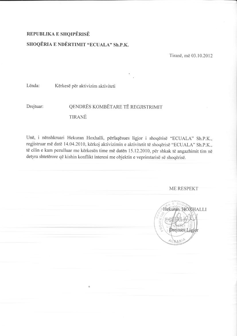 | Legal Cases: | I. Me date 15.12.2010, u pezullua aktiviteti i shoqerise duke kaluar nga status “Aktiv” ne “Pezulluar”. II. Me date 03.10.2012, u aktivizua veprimtaria e shoqerise duke kaluar nga statusi “Pezulluar” ne statusin “Aktiv”. III. Me date 29.10.2014, me vendim te asamblese se ortakeve, u miratua pjesmarrja e shoqerise ECUALA ne rolin e debitorit solidar gjate procesit te financimit ne shumen maksimale 1 000 000 Euro, te "Mesopotam Energy" shpk prane PROCREDIT BANK, ne perputhje me kushtet e specifikuara ne kontratat qe do nenshkruhen midis paleve per kete qellim. U miratua lenia si garanci ne fovor te PROCREDIT BANK: (I) te çdo pasurie te luajteshme e te paluajteshme ne pronesi te shoqerise "Ecuala" shpk. (ii) te aseteve e pasurive qe do te sugurohen nga financimi qe do te merret prane PROCREDIT BANK. (iii) te 100% e kuotave te shoqerise qe zoterohen nga ortaket Andrea Miço (47%), Koço Gjilo (40%), Lavdimir Fusha (10%) dhe Hekuran Hoxhalli (3%). IV. Me date 12.04.2019, me vendim te asamblese se ortakeve, u pezullua per nje afat te pacaktuar aktiviteti i shoqerise. Statusi kaloi nga “Aktiv” ne “Pezulluar”. |