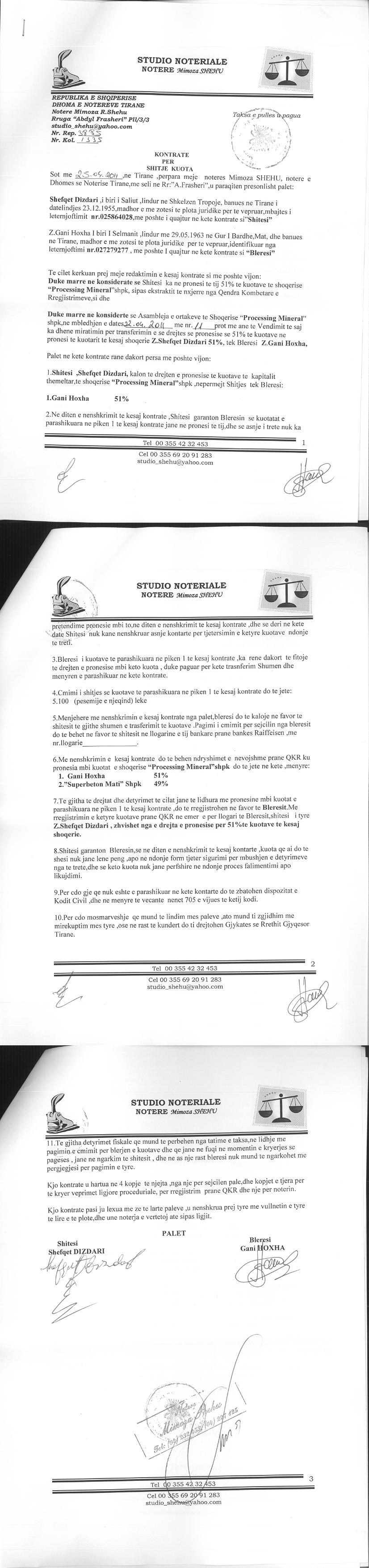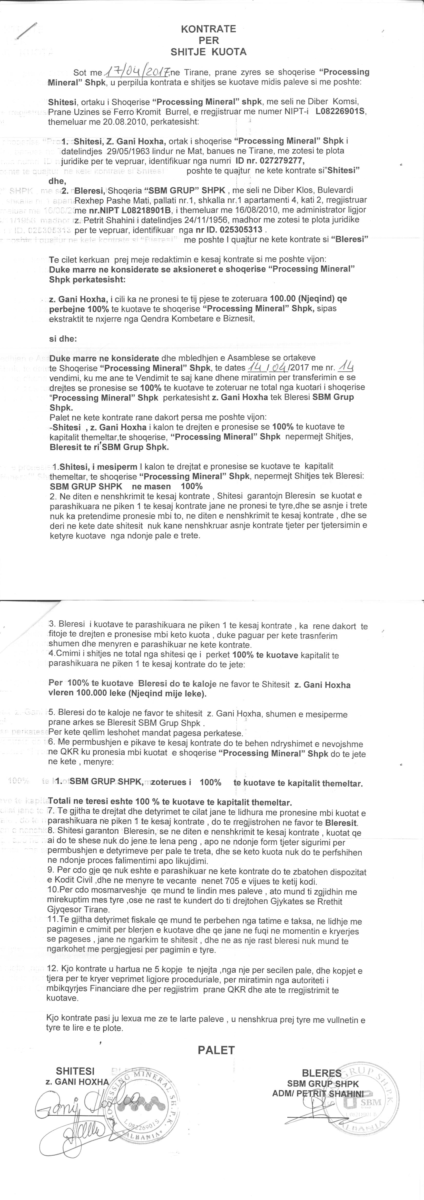 → Ekstrakt historik i regjistrit tregtar date 01.06.2022 → Akti i themelimit → Kontrate per shitjen e kuotave 25.04.2011 → Kontrate per shitjen e kuotave 13.06.2011 → Kontrate per shitje kuotash 01.06.2016 → Kontrate per shitje kuotash 17.04.2017 → Kontrate per shitje kuotash 12.06.2017 → Vendimi per aktivizimin e shoqerise 29.08.2017 → Kontrate shitje-blerje kuotash 28.09.2017 → EKSTRAKT HISTORIK I REGJISTRIT TË PRONARIT PËRFITUES 31.03.2021 → Ekstrakti Historik i Regjistrit Tregtar date 17.05.2024 |