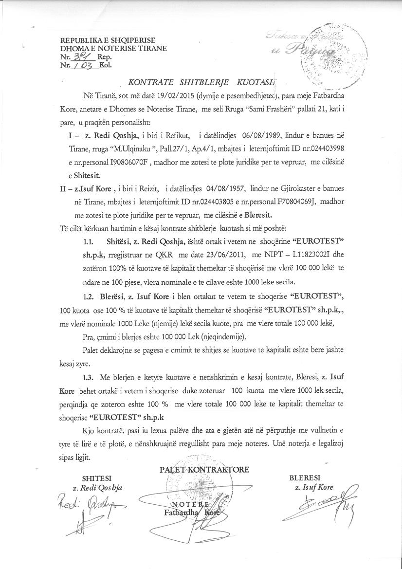 → Ekstrakt historik i regjistrit tregtar 24.12.2020 → Akti i themelimit → Kontrate shitblerje kuotash 15.05.2013 → Kontrate shitblerje kuotash 19.02.2015 → Ekstrakti Historik i Regjistrit Tregtar date 09.05.2023 → Kontrate shitblerje kuotash 04.01.2022 → Ekstrakti Historik i Regjistrit te Pronareve Perfitues date 09.05.2023 |