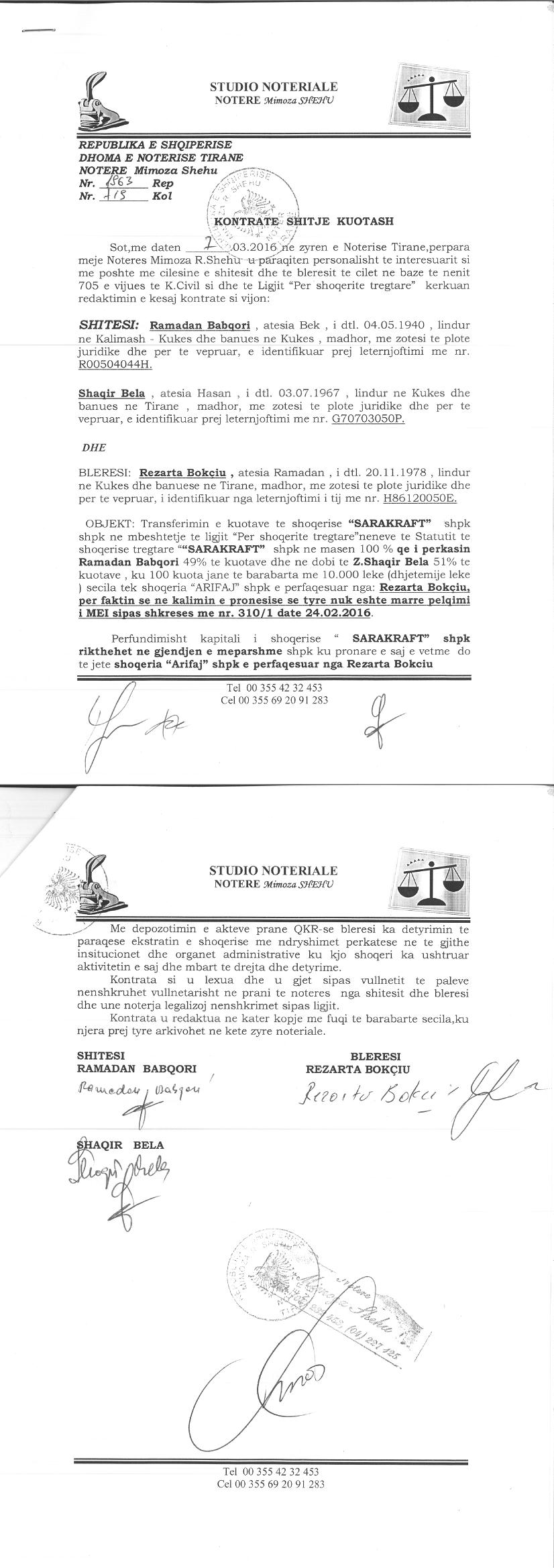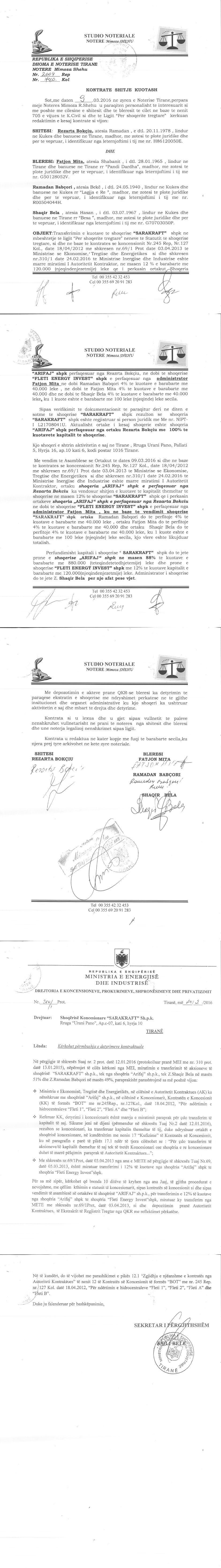 → Kontrate koncesioni (18.04.2012) → Akt themelimi i Shoqerise → Ekstrakti Historik i Regjistrit Tregtar date 17.05.2022 → Kontrate e Shitjes se Kuotave date 07.03.2016 → Kontrate e Shitjes se Kuotave date 09.03.2016 → Kontrate e Shitjes se Kuotave date 12.05.2015 → Preventivi → EKSTRAKT HISTORIK I REGJISTRIT TË PRONARIT PËRFITUES, terhequr 17.05.2022 → Urdher per Venien e Sekuestros date 08.01.2020 → Urdher per Heqjen e Sekuestros date 30.01.2020 → Ekstrakti Historik i Regjistrit Tregtar date 19.04.2024 |