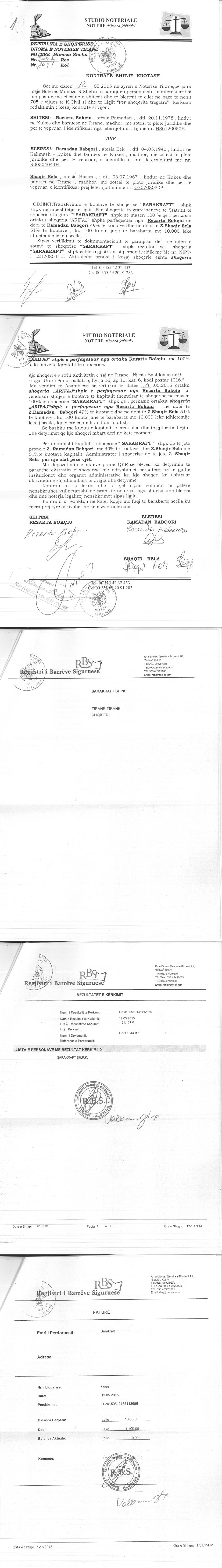 | Legal Cases: | I. Më datë 05.12.2014, me anë të shkresës Nr.87623/16, lëshuar nga Drejtoria Rajonale Tatimore Tiranë, u kërkua vendosja e barrës siguruese mbi titujt e pronësisë të subjektit “SARAKRAFT“ sh.p.k, me synim mos lejimin e tjetërsimit të titujve të pronësisë, përfshi shit-blerje aksionesh, deri në shlyerjen e detyrimeve tatimore nga ana e tatimpaguesit debitor. II. Më datë 15.05.2015, me anë të kërkesës për lirimin nga Barra e Sigurisë mbi titujt e pronësisë Nr. 33877/2 Prot., lëshuar nga Drejtoria Rajonale Tatimore Tiranë, u kërkua lirimi nga barra e sigurësë për subjektin "SARAKRAFT", e vendosur me shkresën Nr. 87623/16 prot, datë 05.12.2014. III. Më datë 25.07.2018, me vendim te asamblesë së ortakëve, u pezullua aktiviteti i shoqërisë për një periudhe kohe të pacaktuar. Statusi i shoqërisë ndryshoi nga “Aktiv” në “Pezulluar”. IV. Me date 08.01.2020, me ane te Urdhrit Nr. 64/1 0172-19 Prot, leshuar nga shoqeria permbarimore Kodra Bailiff Service SHPK, u vendos masa e sekuestros konservative ne kuotat qe zoteron debitori, shoqeria Arifaj SHPK ne subjektin SARAKRAFT SHPK me NUIS (NIPT) L21708041U, si dhe mbi te drejtat qe rrjedhin nga zoterimi i ketyre aksioneve/kuotave duke ndaluar tjetersimin dhe/ose disponimin e tyre si dhe mos kryerjen e asnje veprimi tjeter i cili mund te ndryshoje te dhenat e regjistrit tregtar. Dokumentacioni do te qendroje i bllokuar deri ne nje urdher te dyte. Kreditor: Shoqeria "VARVARA" Sh.p.k. Objekti: Likujdim Fature. V. Me date 30.01.2020, me ane te Urdhrit Nr. 64/1 0172-19 Prot, leshuar nga shoqeria permbarimore Kodra Bailiff Service SHPK, u hoq masa e sekuestros konservative ne kuotat qe zoteron debitori, shoqeria Arifaj SHPK ne subjektin SARAKRAFT SHPK me NUIS (NIPT) L21708041U, si dhe mbi te drejtat qe rrjedhin nga zoterimi i ketyre aksioneve/kuotave. |