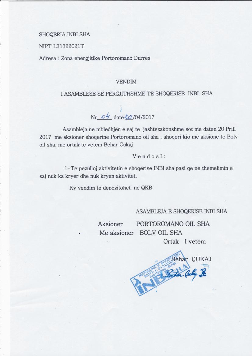 → Ekstrakt historik i regjistrit tregtar date 02.04.2023 → Akti i themelimit → Kontrate shitje aksionesh date 19.08.2013 → Vendimi i asamblese per pezullimin e aktivitetit date 20.04.2017 → Te dhenat e subjektit ne regjistrin e pronareve perfitues date 02.04.2023 |