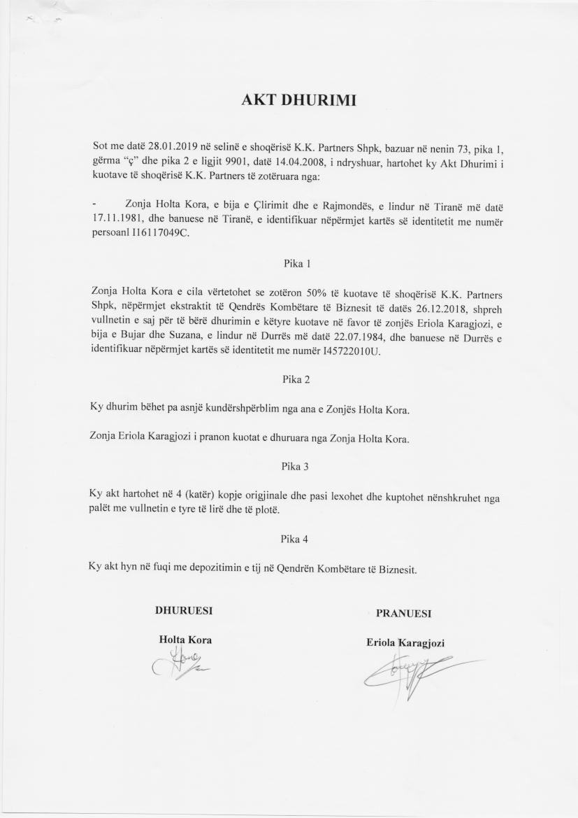 → Ekstrakti Historik i Regjistrit Tregtar date 21.05.2024 → Statuti i Shoqerise → Kontrate e Dhurimit te Kuotave date 16.10.2015 → Akt dhurimi date 28.01.2019 → Kontrate e Shitblerjes se Kuotave date 18.10.2022 |
