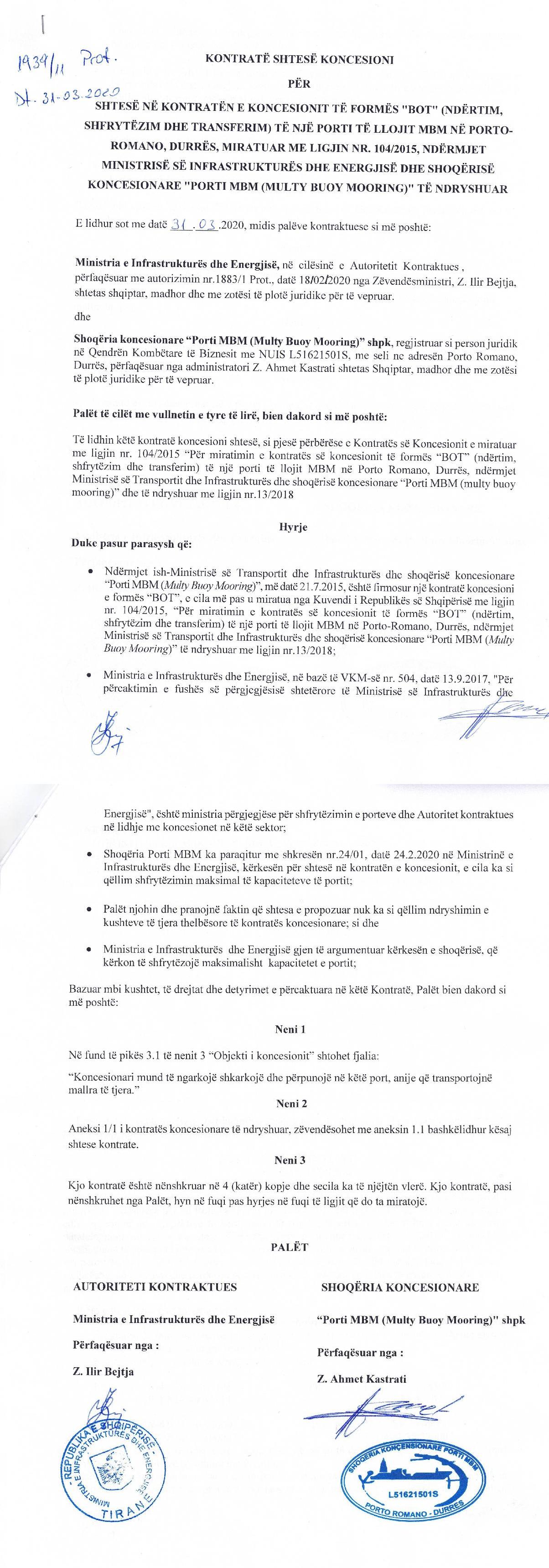 → Ekstrakt historik I regjistrit kombetar (24.12.2018) → Kontrate Koncesionare 30.06.2015 → Ekstrakt historik i regjistrit tregtar 25.02.2023 → Kontrate dhurimi kuote 19.02.2019 → Kontrate shitje kuotash 21.02.2019 → Aneksi 1 → Ligj Nr. 58/2020 date 30.04.2020 per miratimin e shteses se kontrates se koncesionit → RELACION PËR PROJEKTLIGJIN “PËR MIRATIMIN E SHTESËS SË KONTRATËS SË KONCESIONIT" → DEKRET PËR KTHIMIN E LIGJIT NR. 58/2020, date 22.05.2020 → Kontrate shtese koncesioni 31.03.2020 → Shtese e kontrates se koncesionit, dhjetor 2017 → RELACION PËR PROJEKTLIGJIN “PËR MIRATIMIN E SHTESËS SË KONTRATËS SË KONCESIONIT TË FORMËS “BOT” (NDËRTIM, SHFRYTËZIM DHE TRANSFERIM) TË NJË PORTI TË LLOJIT MBM NË PORTO-ROMANO, DURRËS → RAPORT Për projektligjin "Për miratimin e shtesës së kontratës së koncesionit të formës “BOT” (ndërtim, shfrytëzim dhe transferim) të një porti të llojit MBM në Porto-Romano, Durrës, date 13.03.2018 → RAPORT i KOMISIONIT PER VEPRIMTARITE PRDHUESE, TREGTINE DHE MJEDISIN, DATE 19.02.2018, PËR PROJEKTLIGJIN “PËR MIRATIMIN E SHTESËS SË KONTRATËS SË KONCESIONIT TË FORMËS “BOT” (NDËRTIM, SHFRYTËZIM DHE TRANSFERIM) TË NJË PORTI TË LLOJIT MBM NË PORTO-ROMANO, DURRËS → Urdher Nr. 193, datë 3.5.2019 per miratimin e rregullores për funksionimin e portit të përpunimit të lëndëve djegëse për shoqërinë koncesionare “Porti MBM” në Romano Port Durrës → Urdher Nr. 194, datë 3.5.2019 per miratimin e rregullores “Për organizimin dhe funksionimin e strukturës të sigurisë portuale të ‘Portit MBM’ Romano Port Durrës” → EKSTRAKT HISTORIK I REGJISTRIT TË PRONARIT PËRFITUES date 25.02.2023 → Marreveshje siguruese date 28.07.2021 → Shtojcat e kontrates se koncesionit → Ekstrakti Historik i Regjistrit Tregtar date 20.06.2023 → Ekstrakti Historik i Regjistrit Tregtar date 22.08.2023 → Ekstrakt Historik i Regjistrit Tregtar date 26.03.2024 → Ekstrakt Historik i Regjistrit te Pronareve Perfitues date 26.03.2024 |