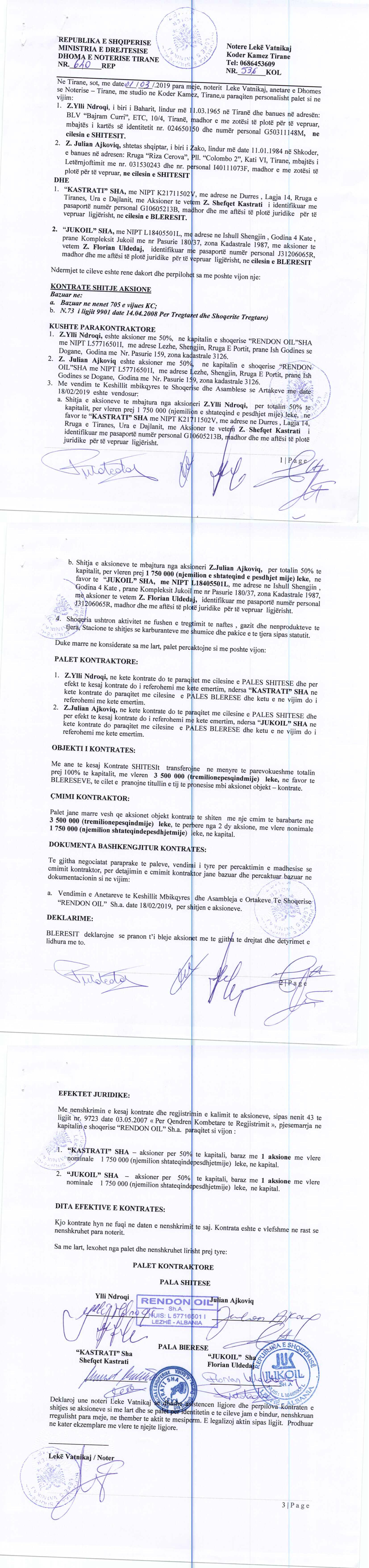 | Parent Company / Owner: | I. “KASTRATI GROUP”, nje shoqeri aksionare, e themeluar me date 30/04/2002 sipas ligjeve te Republikes se Shqiperise, me numer identifikimi biznesi NIPT K21711502V, me adrese aktuale ne Durres Lagja 14, Rruga "Tiranes", Ura e "Dajlanit”, dhe me administrator Gani Kastrati. Ortakët e shoqërisë janë Shefqet Kastrati 65%, Shefit Kastrati 20%, Selam Kastrati 5%, Haredin Kastrati 5% dhe Bilbil Kastrati 5%. (Sipas të dhënave të QKB deri më datë 26.03.2024) II. “JUKOIL”, nje shoqeri aksionare, e themeluar me date 04/10/2011 sipas ligjeve te Republikes se Shqiperise, me numer identifikimi biznesi NIPT L18405501L, me adrese aktuale ne Lezhe Shengjin Ishull Shengjin, Godine 4-kateshe, prane kompleksit Jukoil, me nr. Pasurie 180/37, zona kadastrale 1987, dhe me administrator Florian Uldedaj. Ortak i vetëm i shoqërisë është Rozë Uldedaj, zotëruese për 100% të kapitalit. (Sipas të dhënave të QKB deri më datë 26.03.2024) |