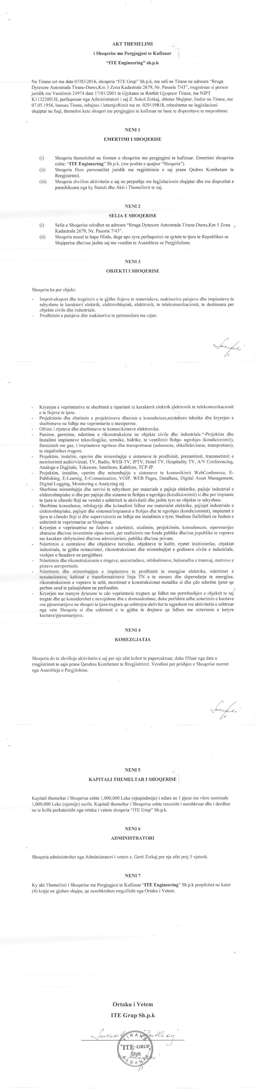 | Additions: | Ne date 04.08.2020: Ne baze te Vendimit te Ortakut date 15.07.2020 eshte miratuar hapja e deges se shoqerise "Ite Engineering" ne Kosove me perfaqesues Gerti Zotkaj. |