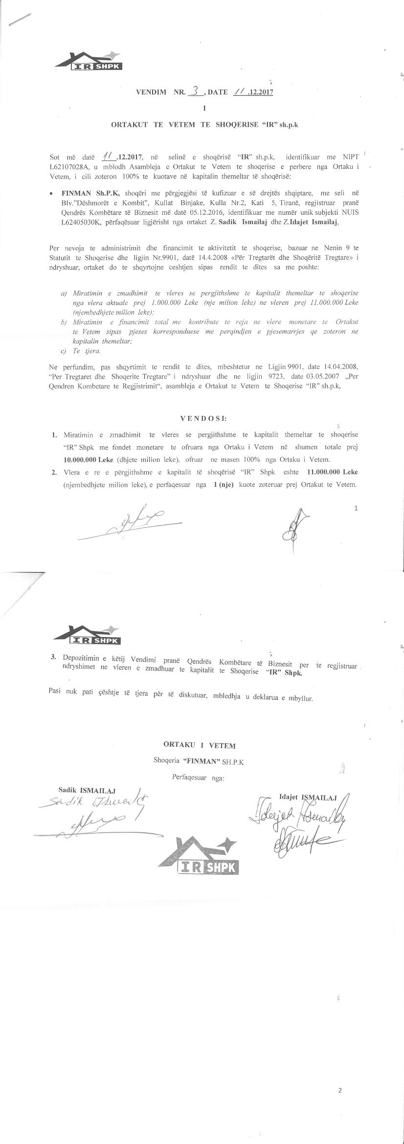 | Parent Company / Owner: | “ALB - STAR”, shoqëri me përgjegjësi të kufizuar, e themeluar më datë 15/02/1995, sipas ligjeve të Republikës së Shqipërisë, me numër identifikimi në regjistrin tregtar NIPT J62903512W, me adresë aktuale në Tirane Sheshi Italia, Arena Center, Seksioni D, Kati 5, dhe me administrator Sokol Agalliu. “FINMAN” zotëron 100% të kapitalit. (Sipas të dhënave të QKB deri më datë 15.02.2024) Sipas Ekstraktit Historik te Regjistrit te Pronarit Perfitues, depozituar në QKB date 08.03.2022, terhequr date 15.02.2024, Pronaret perfitues te subjektit “IR”, zoterues te 25% te kapitalit e me teper, është: Idajet Ismailaj, shtetas shqiptar, i datelindjes 1963, pronar perfitues per 57% te kapitalit, pasi zotëron 100% të kapitalit të shoqërisë “Motus”, e cila zotëron 57% të kapitalit të shoqërisë “Finman” dhe kjo e fundit zotëron 100% të kapitalit të shoqërisë “Alb – Star” – shoqëri mëmë për 100% të kapitalit të shoqërisë “IR”. Data e percaktimit si pronar perfitues eshte 07.02.2022. |