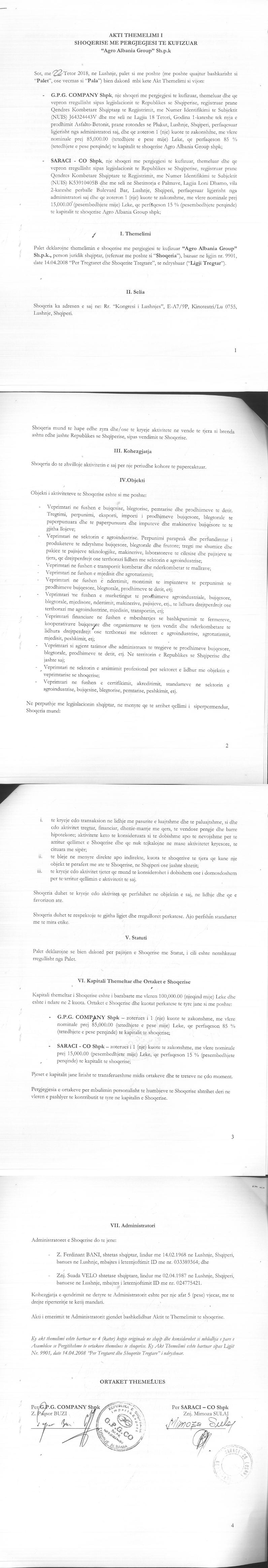 | Scope: | Veprimtari në fushën e bujqësisë, blegtorisë, pemtarisë dhe prodhimeve të detit. Tregtimi, përpunimi, eksporti, importi i prodhimeve bujqësore, blegtorale të papërpunuara dhe të papërpunuara dhe imputeve dhe makinerive bujqësore të të gjitha llojeve. Veprimtari në sektorin e agroindustrisë. Përpunimi paraprak dhe përfundimtar i produkteve të ndryshme bujqësore, blegtorale dhe frutore, tregti me shumicë dhe pakicë të pajisjeve teknologjike, makinerive, laboratoreve të cilësisë dhe pajisjeve të tjera, që drejtpërdrjetë ose tërthorazi lidhen me sektorin e agroindustrisë. Veprimtari në fushën e transportit kombëtar dhe ndërkombëtar të mallrave. Veprimtari në fushën e mjedisit dhe agroturizmit. Veprimtari në fushën e ndërtimit, montimit të impianteve të përpunimit të prodhimeve bujqësore, blegtorale, prodhimeve të detit, etj. Veprimtari në fushën e marketingut të prodhimeve agroindustriale, bujqësore, blegtorale, mjedisore, ndërtimit, makinerive, pajisjeve, etj, të lidhura drejtpërdrejtë ose tërthorazi me agroindustrinë, mjedisin, transportin, etj. Veprimtari financiare në fushën e mbështetjes së bashkëpunimit të fermerëve, kooperativave bujqësore dhe organizmave të tjera vendit dhe ndërkombëtare të lidhura drejtpërdrejtë ose tërthorazi me sektorët e agroindustrisë, agroturizmit, mjedisit, peshkimit, etj. Veprimtari si agjent tatimor dhe administrues të tregjeve të prodhimeve bujqësore, blegtorale, prodhimeve të detit, etj në territorin e Republikës së Shqipërisë dhe jashtë saj. Veprimtari në sektorin e arsimimit profesional për sektorët e lidhur me objektin e veprimtarisë së shoqërisë. Veprimtari në fushën e çertifikimit, akreditimit, standarteve në sektorin e agroindustrisë, bujqësisë, blegtorisë, pemtarisë, peshkimit, etj. Shoqëria mund të kryejëe çdo transaksion nëe lidhje me pasuritë e luajtshme apo të paluajtshme si dhe çdo aktivitet tregtar, financiar, qeradhënieje apo hipoketimi, të cilat mund të konsiderohen si të dobishme apo të nevojshme për arritjen e objektit teë Shoqërisë. Të blejë në mënyrë të drejtpërdrejtë apo të tërthortë interesa në shoqëri të tjera me objekt të ngjashëm me atë të Shoqërisë, në Shqipëri apo jashtë saj, dhe të kryejë çdo aktivitet tjetër që mund të konsiderohet i dobishëm apo i nevojshëm në mënyrë arritjen e objektit të Shoqërisë. Shoqëria duhet të kryejë çdo aktivitet që përfshihet në objektin e saj, në lidhje dhe që e favorizon atë. Shoqëria duhet të respektojë të gjitha ligjet dhe rregulloret përkatëse. Ajo përfshin standartet më të mira etike. |