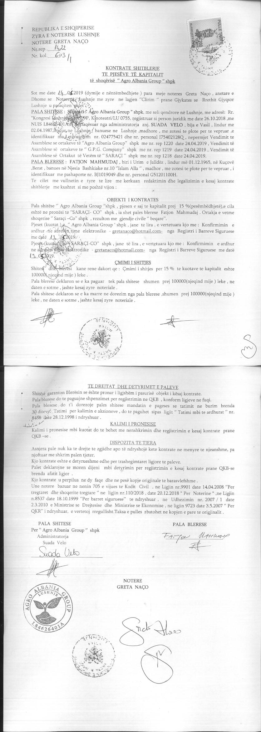 → Statuti → Akti I themelimit → Kontrate shitblerje e pjeseve te kapitalit → Ekstrakt Historik i Regjistrit Tregtar, date 19.11.2021 → Kontrate Shitblerje, date 08.01.2020 → Kontrate shitblerje, date 10.12.2019 → Vendim i Ortakve te shoqerise, date 05.12.2019 |