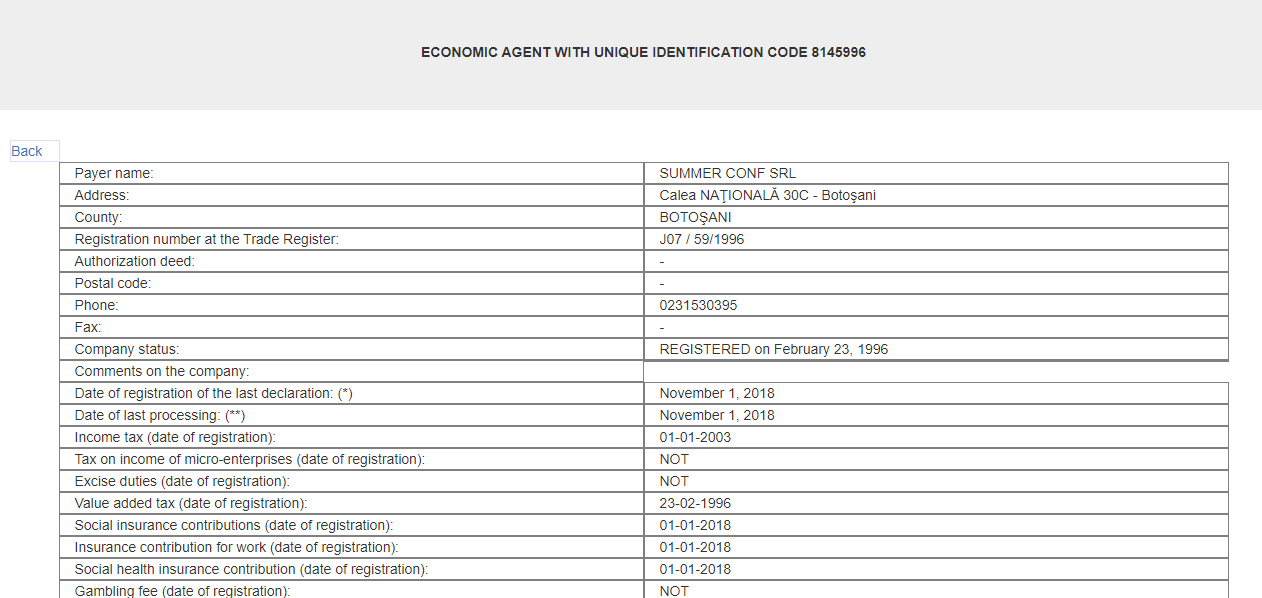 → Te dhenat e Ministrise se Financave Rumani per SUMMER CONF SRL, date 28.01.2021 → Raport i shoqerise SUMMER CONF SRL, marre nga RisCo.ro date 18.06.2021 |