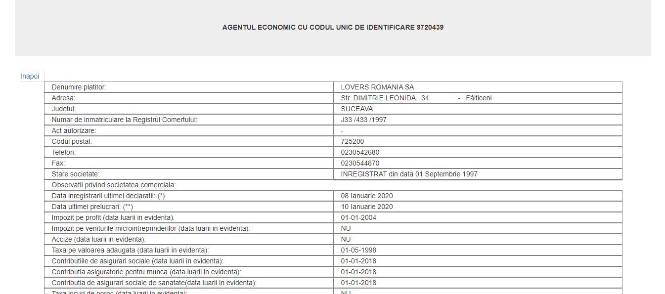 → Te dhenat e Ministrise se Finances Rumani per Lovers Romania sa, date 27.01.2021 → Raport i shoqerise Lovers Romania sa, marre nga RisCo.ro date 18.06.2021 |