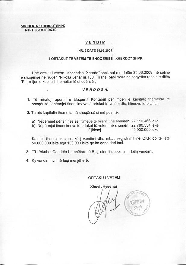 Vendim i Ortakut të Vetëm për Zmadhimin e Kapitalit datë 25.06.2009