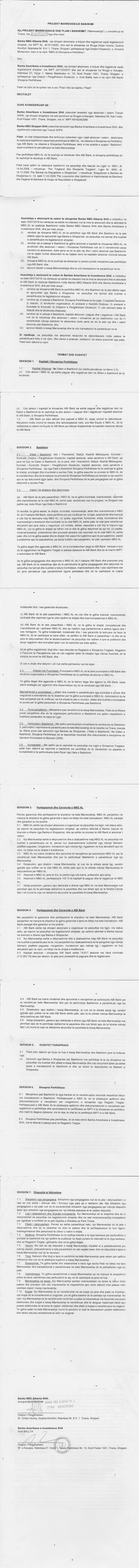 → Ekstrakt historik i regjistrit tregtar 06.09.2022 → Urdher per heqjen e sekuestros konservative 06.06.2016 → Vendim I keshillit drejtues per emerimin e administratoreve 13.03.2014 → Projekt marreveshja e bashkimit ndermjet ABI Bank dhe NBG Albania 16.07.2018 → Urdher per venien e sekuetros konservative 24.05.2016 → Akt transferimi aksionesh 03.07.2018 → Vendim per miratimin e doreheqjeve dhe emerimin e anetareve te rinj te bordit 03.07.2018 → Vendimi I asamblese se aksionereve per rimerimin e anetareve te keshillit drejtues 16.05.2016 → Vendimi I asamblese per rritjen e kapitalit aksionar 30.11.2012 → Ekstrakt Historik i Regjistrit te Pronareve Perfitues, date 07.09.2022 |