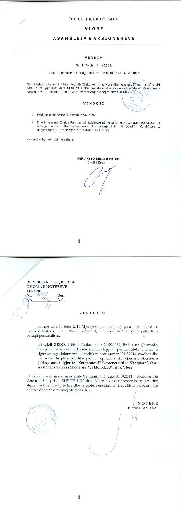 | Çështje Ligjore: | Me date 01.08.2011, me vendim te aksionarit te vetem, u miratua prishja e shoqerise "ELEKTRIKE" sh.a. dhe emerimi i znj.Eneida Rahmani, si likuidatore per kryerjen e proçedurave perkatese per mbylljen e te gjitha veprimtarive dhe çregjistrimin e shoqerise |