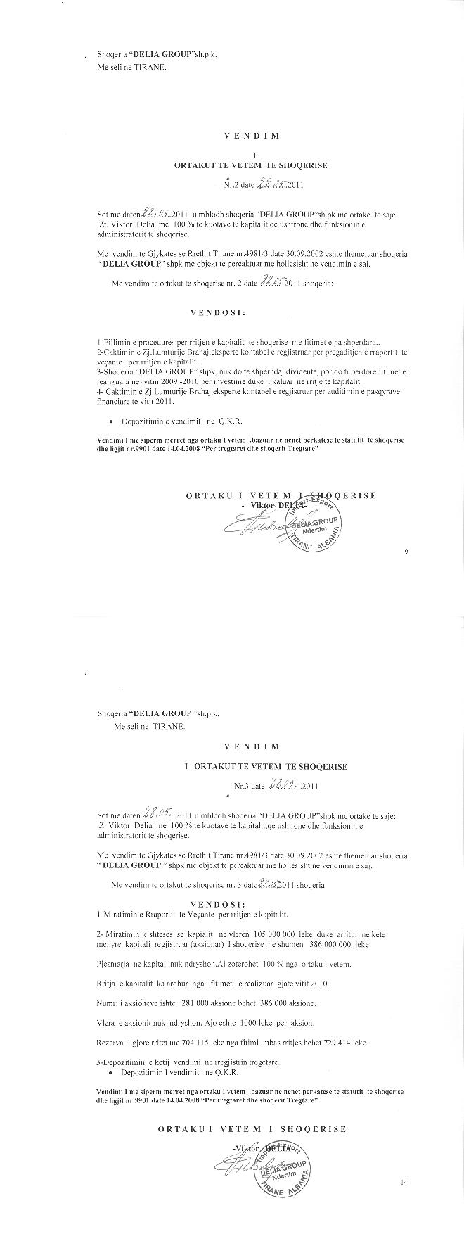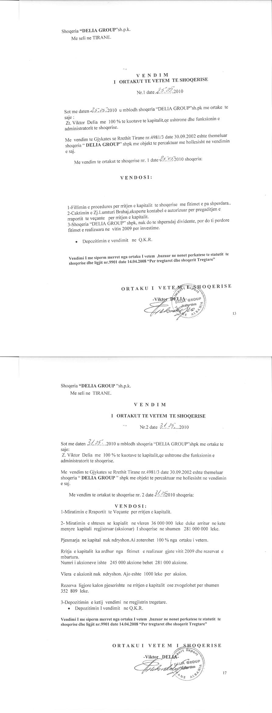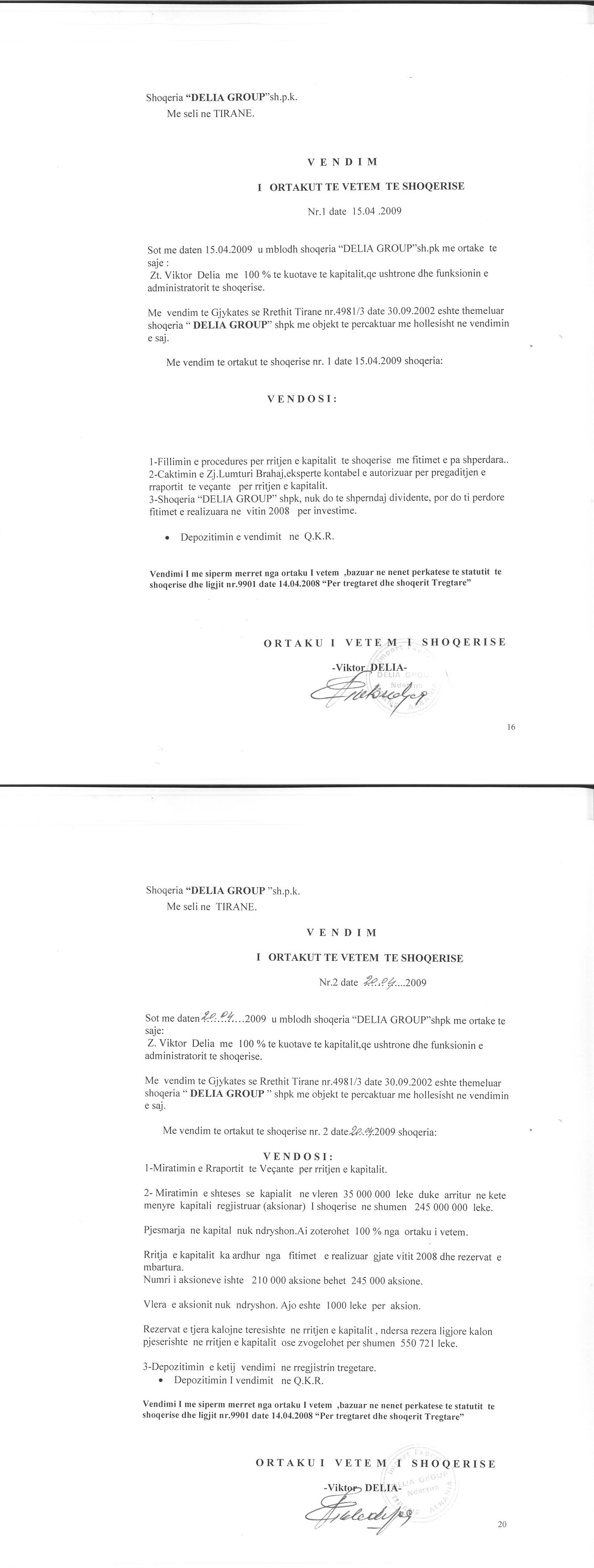 | Çështje Ligjore: | I. Me date 02.12.2013, me ane te Urdhrit Nr.56 Prot, Nr. 26 Dosje, leshuar nga shoqeria Permbarimore “ VAKO&PARTNERS BAILIFF SERVICES” shpk, drejtuar QKR, u urdherua vendosja e mases se sekuestros konservative mbi te gjitha aksionet e zoteruara nga debitori shoqeria “ Delia Group” shpk, me NUIS (NIPT) J81517002U. II. Me date 13.10.2014, me ane te Urdhrit Nr. 1504 Prot, Nr.Dosje 362 "Për Vënien e Sekuestros Konservative”, lëshuar nga Shoqëria Përmbarimore Gjyqësore Private “Vako & Partners Bailiff Service” sh.p.k., drejtuar QKR, u urdherua vendosja e masës së sekuestros konservative mbi te gjitha aksionet e zotëruara nga debitori “DELIA GROUP” sh.p.k., me NUIS (NIPT) J81517002U dhe z.Viktor Delia ne cilesine e administratorit te shoqerise "DELIA GROUP” sh.p.k. III. Me date 28.10.2014, me ane te Vendimit per Pushimin e Ekzekutimit Nr.1617 Prot, lëshuar nga Shoqëria Permbarimore Gjyqesore Private "Vako & 11 Partners Bailiff Service" sh.p.k, u urdherua Qendra Kombetare e Regjistrimit te beje zhbllokimin e aksioneve te shoqerise "Delia Group" sh.p.k., me NUIS (NIPT) J81517002U, te bllokuara me ane te shkreses Nr.1504 Prot.,date 13.10.2014 te shoqërise Permbarimore Gjyqesore Private "Vako & Partners Bailiff Service" sh.p.k, per Urdhrin e Ekzekutimit Nr.975 Regj. Them, te leshuar ne date 16.09.2014 prej Gjykates Administrative se Shkalles se Pare Tirane". |