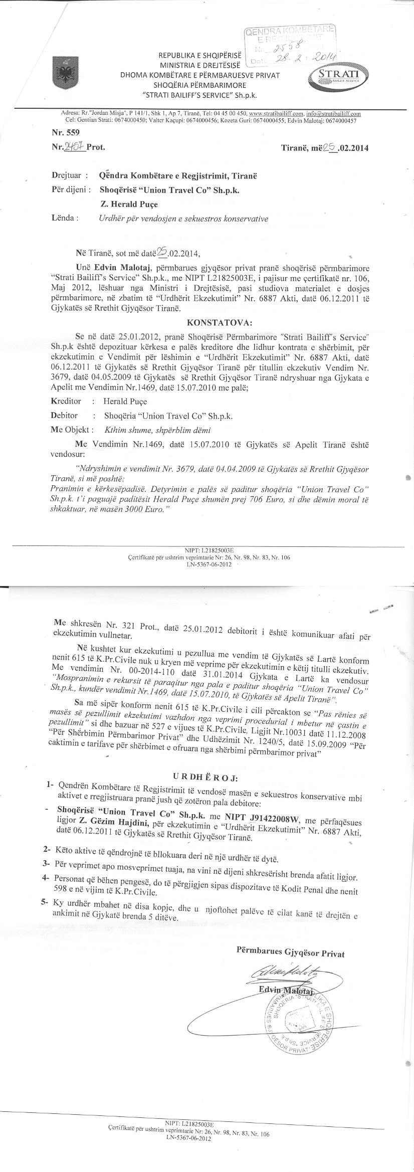 | Çështje Ligjore: | 1. Më datë 05.03.2014, shoqëria përmbarimore “STRATI BAILIFF'S SERVICE” sh.p.k., lëshon urdhërin për vendosjen e masës së sekuestros konservative mbi aktivet e UNION TRAVEL CO, për shkak të mos pagesës së shumës prej 706 euro dhe shpërblimit të dëmit moral prej 3000 eurosh ndaj paditësit Herald Puçe. Këto aktive do të qëndrojnë të bllokuara deri në një urdhër të dytë. 2. Më datë 17.04.2014, Shoqëria Përmbarimore “Strati Bailiff’s Service" sh.p.k, lëshon urdhërin për heqjen e masës së sekuestros konservative mbi aktivet e UNION TRAVEL CO, në kushtet kur detyrimi i shoqërisë është shlyer plotësisht. 3. Ne shoqërinë UNION TRAVEL CO kufizohen kompetencat e Administratorit si me poshte: Administratori nuk ka kompetence per te perfaqesuar Shoqerine ne veprimet e meposhtme pa miratimin e Asamblese se Pergjithshme: a) Te lidhe kontrata, te kryeje nje transaksion apo veprim, (perfshire por pa u kufizuar ne blerje, shitje, etj) vlera e te cilit kalon Shumen prej 5.000.000 (pese milion) Leke apo disa transaksione/veprime me nje person te vetem vlera totale e te cilave kaion shumen prej 10.000.000 (dhjete milion) Leke; b) Te bleje, shese, kembeje apo rendoje me hipoteke ndonje pasuri te paluajtshme te Shoqerise; c) Te marre nje hua te vetme vlera e se ciles kalon shumen prej 2.000.000 (dy milion) Leke apo disa hua nga nje person i vetem apo subjekt, vlera totale e te cilave kaion shumen prej 4.000.000 (kater milion) Leke; d) Te jape nje kredi apo hua; e) Te jape apo marre me qira pasuri te paluajtshme, me perjashtim te automjeteve; f) Te vendose peng mbi nje pasuri te luajtshme, apo te rendoje me peng pasuri te luajtshme te Shoqerise; g) Te punesoje punonjes mbi buxhetin e miratuar ose ne mungese te ketij buxheti, mbi numrin e punonjesve te punesuar ne fund te vitit te meparshem.2. Administratori ka kompetence te kryeje transaksione deri ne shumen 150.000 Eur (njeqind e pesedhjete mije euro) me shoqerine IATA Albania. 3. Administratori nuk ka kufizime per transferim fondesh brenda llogarive te shoqerise Union Travel Co ne bankat e nivelit te dyte me te cilet operon Shoqeria. 4.Autorizohen personat e meposhtem per kryerjen e veprimeve bankare (transaksione) ne llogarite bankare te shoqerise "Union Travel CO" sh.p.k., çelur prane bankave te nivelit te dyte ne Republiken e Shqiperise, perkatesisht si me poshte: (i)Autorizohet: a. Administratori i Shoqerise "Union Travel CO" sh.p.k., Z. Sokol Dodbiba, i. te veproje si firme e vetme e autorizuar per kryerjen e veprimeve bankare (transaksione) pa kufizim ne vlere ne llogarite bankare te shoqerise "Union Travel Co" shpk çelur prane Union Bank sh.a., Banka Kombetare Tregtare sh.a., Raiffeisen Bank sh.a., Intesa SanPaolo Bank sh.a. dhe Tirana Bank sh.a., ne Republiken e Shqiperise. (ii) Autorizohet: a. Z.Gezim Hajdini dhe b. Znj. Silvana Caslli, te veprojne se bashku per kryerjen e veprimeve bankare (transaksione) pa kufizim ne vlere, ne llogarite bankare te shoqerise "Union Travel Co" çelur prane Union Bank sh.a., Banka Kombetare Tregtare sh.a., Raiffeisen Bank sh.a., Intesa SanPaolo Bank sh.a. dhe Tirana Bank sh.a. ne Republiken e Shqiperise.5. Autorizohet Administratori Z. Sokol Dodbiba dhe personat e autorizuar sipas pikes (ii) me siper, ne kryerjen e te gjitha procedurave te nevojshme per depozitimin prane Bankave dhe zbatimin e ketij Vendimi. |