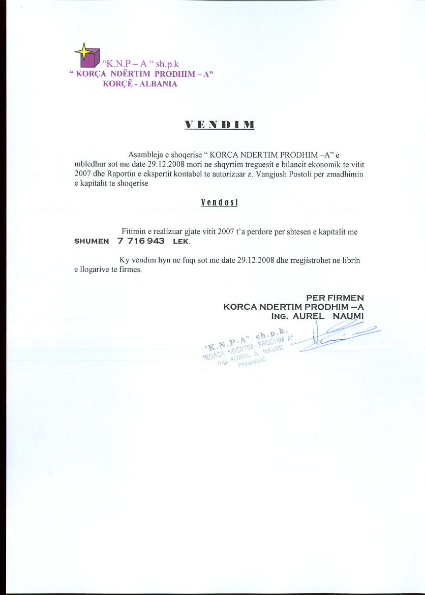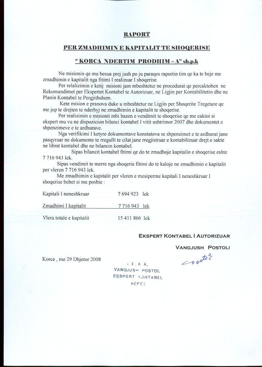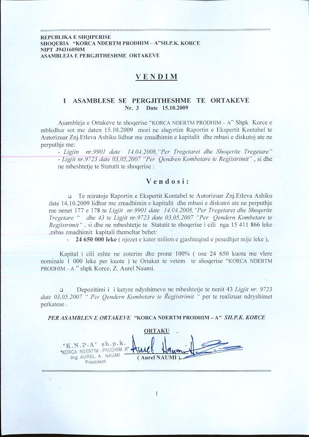 → Ekstrakti Historik i Regjistrit Tregtar date 20.05.2022 → Akt themelimi dhe Statuti i Shoqerise → Vendim i Ortakut te Vetem per Zmadhim Kapitali date 09.01.2002 → Vendim i Ortakut te Vetem per Zmadhim Kapitali date 12.11.2006 → Raport per Zmadhimin e Kapitalit date 29.12.2008 → Vendim i Ortakut te Vetem per Zmadhim Kapitali date 29.12.2008 → Raport per Zmadhimin e Kapitalit date 14.10.2009 → Vendim i Ortakut te Vetem per Zmadhim Kapitali date 15.10.2009 → Ekstrakti Historik i Regjistrit Tregtar date 19.04.2024 → Kerkese per vendosjen e mases se sigurimit te detyrimit tatimor date 28.07.2023 |