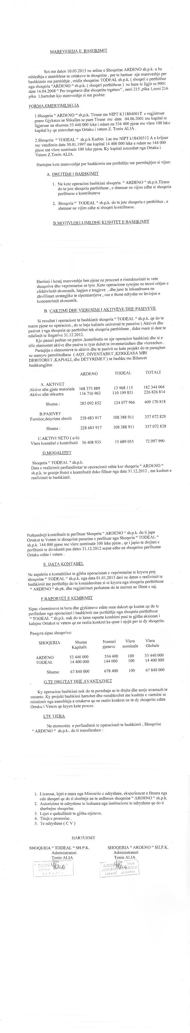 | Çështje Ligjore: | Me date 01.02.2013, u fillua procedura e bashkimit me perthithje te shoqerise "ARDENO" Shpk me Nipt K11804001T(shoqeria perthithese) me shoqerine "TODEAL" Shpk me Nipt K18430312A (shoqeria e perthithur). Me date 10.03.2013, u nenshkrua marreveshja e bashkimit me perthithje. Sipas vleeresimeve te bera eshte rene dakort qe kuotat qe do te perfitohen nga operacioni i bashkimit me perthithje nga shoqeria perthithese “TODEAL” shpk nuk do te kene raporte kembimi pasi te gjitha aksionet i kalojne ortakut te vetem, qe ne rastin konkret ka qene i njejti per te dy shoqerite. Pas bashkimit, kapitali i shoqerise TODEAL shpk do te behet 67.840.000 (gjashtedhjete e shtate milion e teteqind e dyzet mije) leke. |