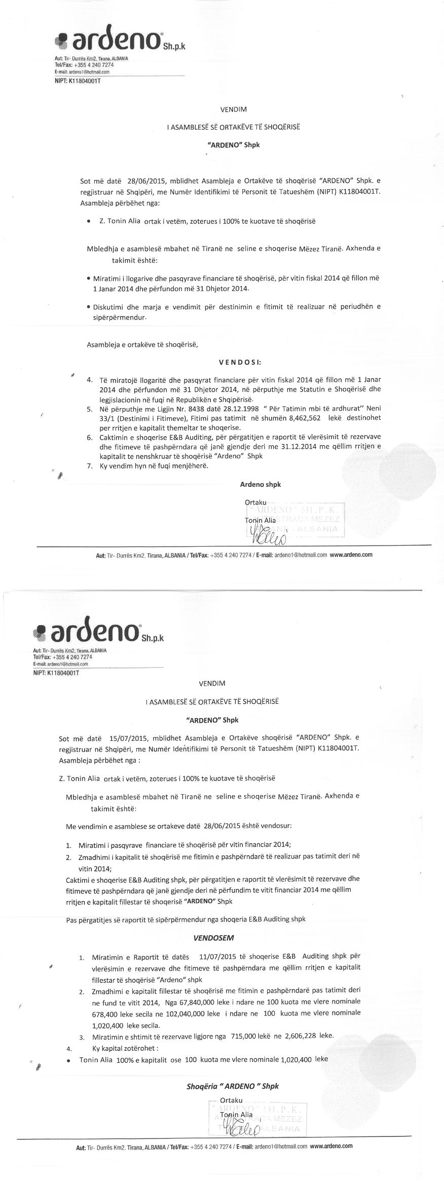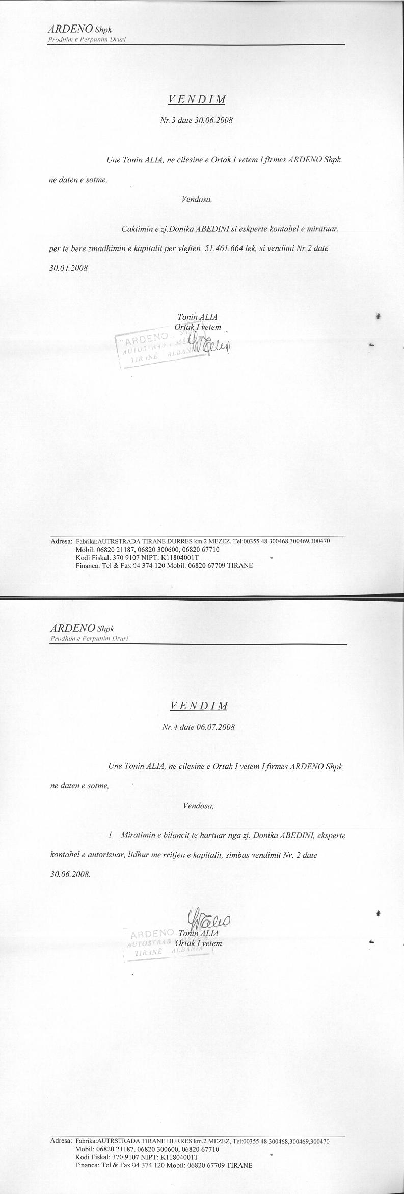 → Ekstrakt historik i regjistrit tregtar date 10.12.2021 → Akti i themelimit dhe statuti → Marreveshja e bashkimit date 10.03.2013 → Vendimi i ortakut per zmadhimin e kapitalit date 06.07.2008 → Vendimi i asamblese se ortakeve per zmadhimin e kapitalit date 28.06.2015 |