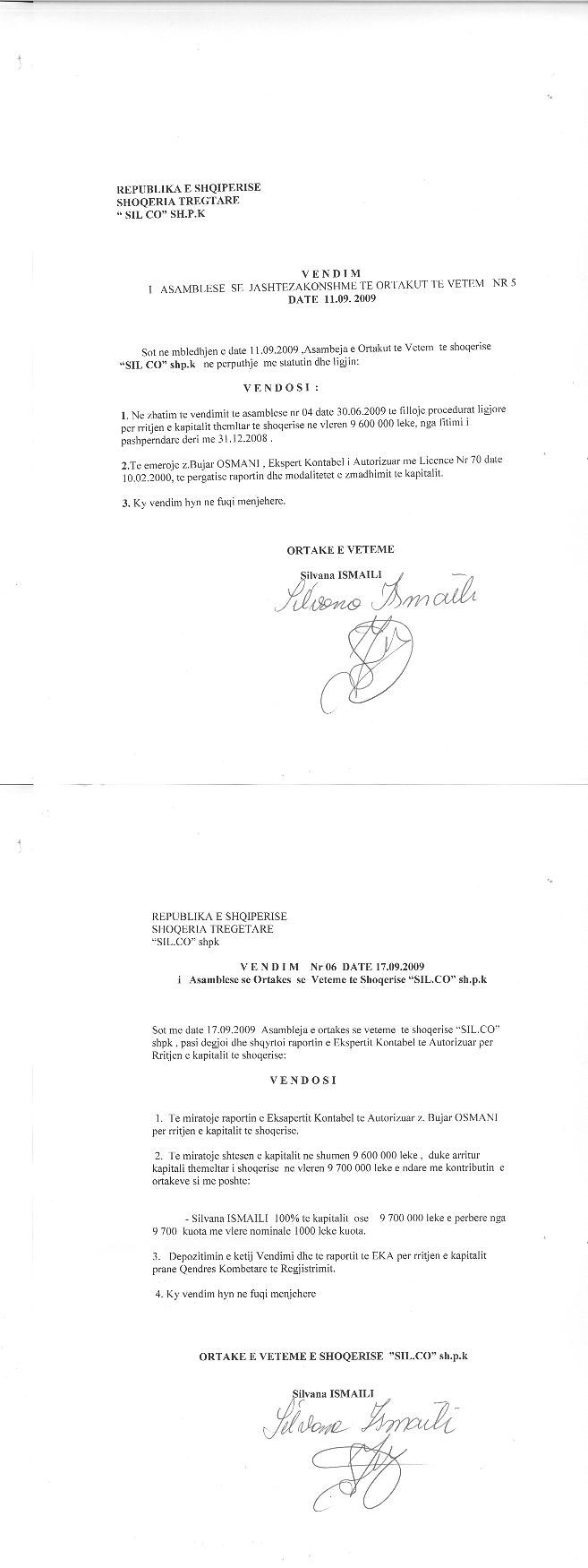shoqerise “SIL.CO” shpk me NIPT K21418001J, me administratore Zj. Trendafile
