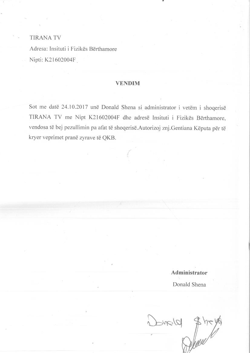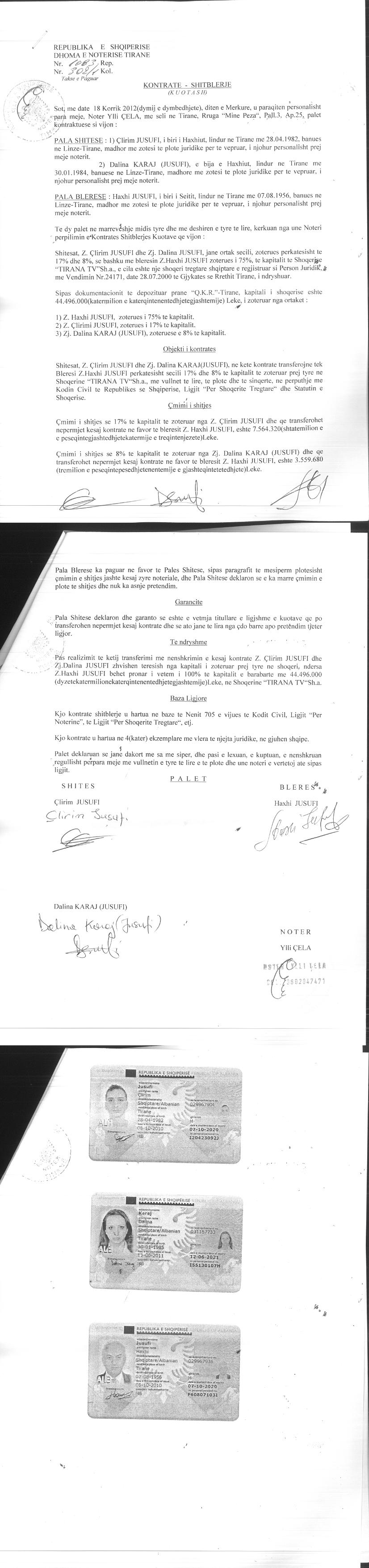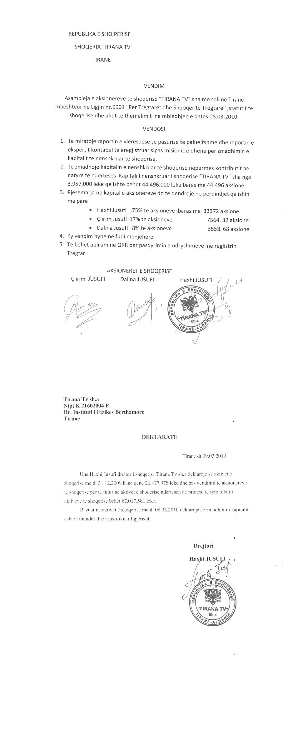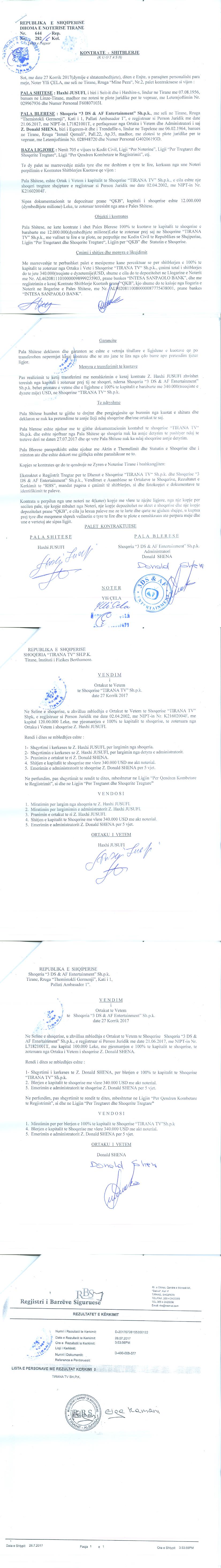 → Ekstrakt historik i regjistrit tregtar date 12.11.2022 → Akti i themelimit dhe statuti → Subjekti TIRANA TV nuk ka regjistruar te dhena ne Regjistrin e Pronareve Perfitues date 12.11.2022 → Ekstrakt historik i regjistrit te pronareve perfitues per ortakun 3 DS & AF Entertainment, date 12.11.2022 → Kontrate shitblerje aksionesh date 24.12.2002 → Kontrate shitblerje date 27.07.2017 → Kontrate shitblerje kuotash date 18.07.2012 → Urdher per venien e sekuestros konservative date 15.11.2021 → Vendimi per pezullimin e shoqerise date 24.10.2017 → Vendimi per zmadhimin e kapitalit date 08.03.2010 → Vendimi i ortakut te vetem per zmadhimin e kapitalit date 12.06.2017 → Ekstrakt Historik i Regjistrit Tregtar date 04.07.2023 → Ekstrakt Historik i Regjistrit te Pronareve Perfitues date 04.07.2023 |