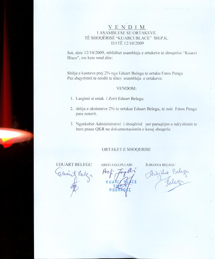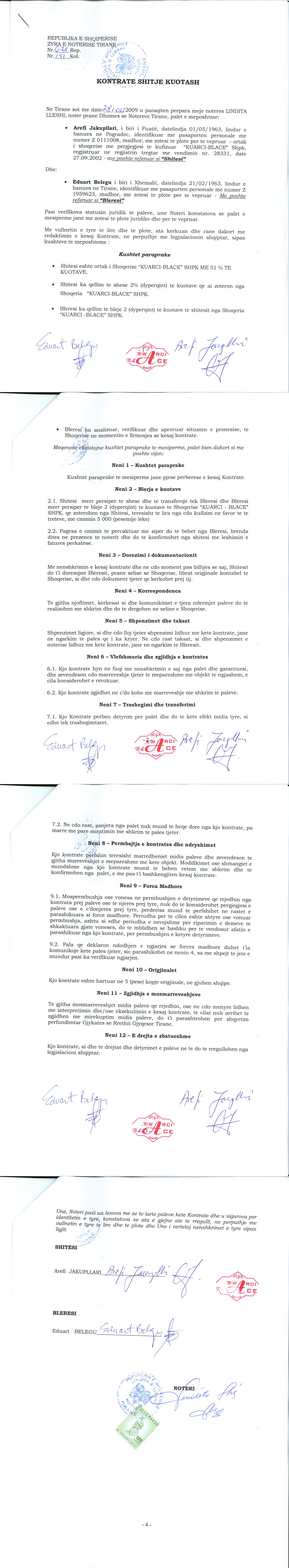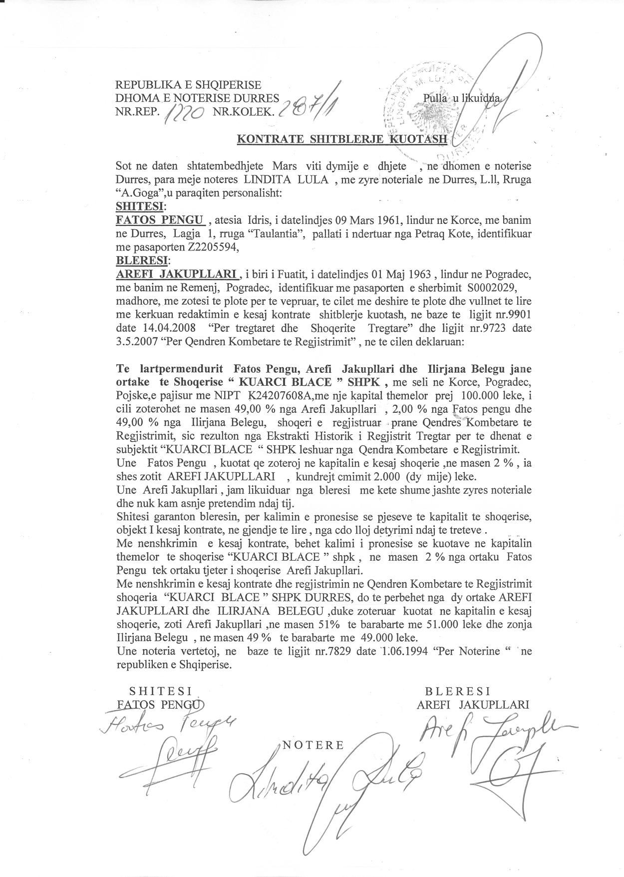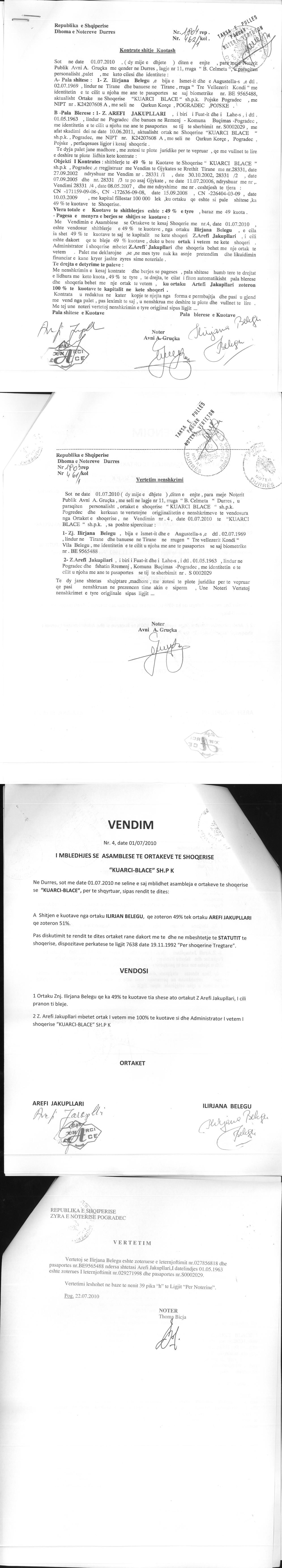 → Ekstrakt historik i regjistrit tregtar date 16.07.2021 → Akti i themelimit → Kontrate shitje kuotash date 28.02.2009 → Kontrate shitje kuotash date 28.10.2002 → Kontrate shitje kuotash 01.07.2010 → Kontrate shit-blerje kuotash date 17.03.2010 → Vendimi i asamblese se ortakeve per shitjen e kapitalit date 12.10.2009 |