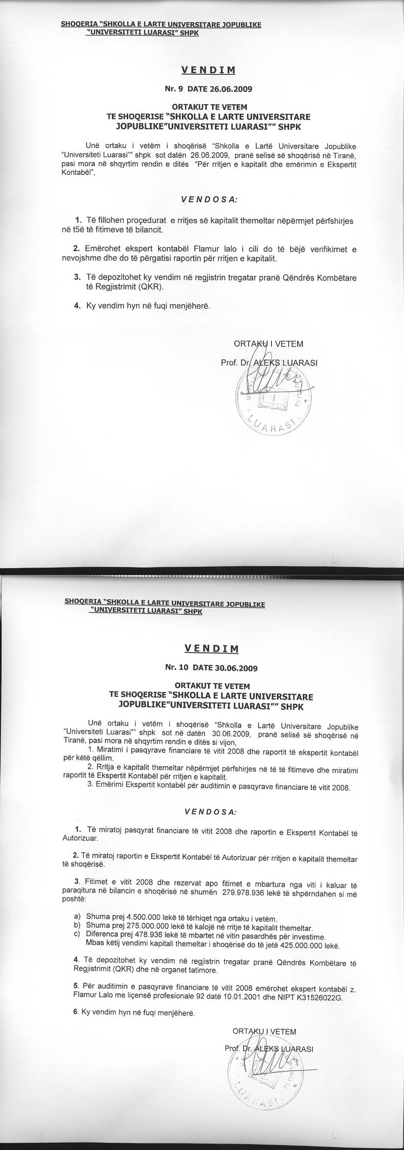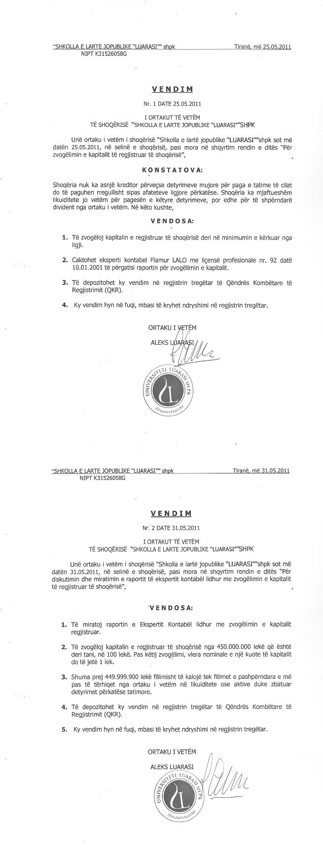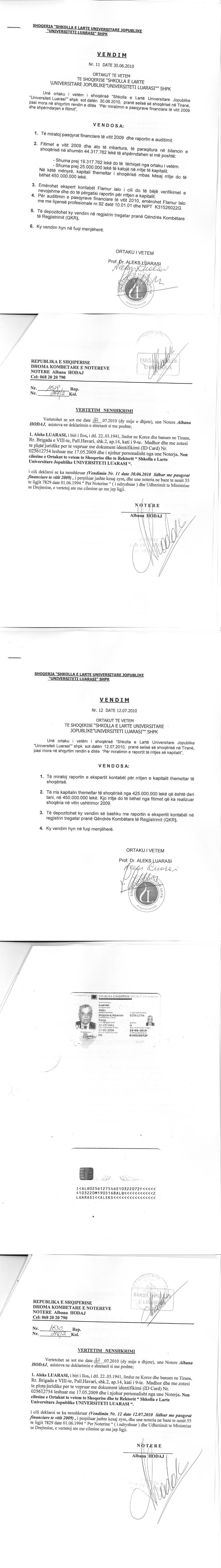 | Objekti i Veprimtarisë: | Te pergatise specialiste te larte ne fushen e shkencave juridike,me formim te pergjithshem.Te kryeje studime, kerkime,botime ne fushen e shkencave juridike.Te kryeje kualifikime shkencore pasuniversitare,kurse te specializimit dhe te kualifikimit afatshkurter e afatgjate.Universiteti ''LUARASI'' do te perbehet nga:a.Fakulteti i Drejtesise (Ekzistues);b.Fakulteti i Shkencave Politike;c.Shkolla e Larte Jouniversitare.Fakulteti i Drejtesise do te jape diploma universitare ne Degen e Drejtesise - Jurist-4 vite akademike;Fakulteti i Shkencave Politike do te kete dy dege dhe do te jape diploma ne:(i) Shkencat e Administrimit Publik (3 vite akademike); (ii) Marredhenie Nderkombetare (3 vite akademike). Shkolla e Larte Jouniversitare do te jape diploma te nivelit jouniversitar per sekretari gjyqesore,,sekretari administrative,sekretari biznesi-2 vite akademike.Te pergatise specialiste te larte ne fushen e shkencave juridike (juriste) me formim te pergjithshem;Te kryeje studime, kerkime dhe botime ne fushen e shkencave juridike dhe sociale te pergjithshme.Botimet akademike do te realizohen nepermjet Shtepise Botuese te emertuar LUARASI UNIVERSITY PRESS,e cila do te jete ne pronesi te Shoqerise;Te kryeje kualifikimin shkencor pasuniversitar,kurse te specializimit, kurse te kualifikimit afatshkurter dhe afatgjate per juristet,si dhe studime te nivelit Master.Te jape konsulence juridike cilesore dhe profesionale ne fushen e te drejtes nepermjet STUDIO LIGJORE UNIVERSITARE 'LUARASI',sherbime te cilat do te kryhen nga Shoqeria. Qender trajnimesh profesionale (ekonomi, jurdik, information Technology [IT]). Edukimi dhe trajnimi Profesional, arsimim te larte, zhvillim te dijeve, te shkences, te inovacionit dhe te profesioneve ne te gjitha llojet e programe te studimit dhe cikleve te arsimit te larte si dhe programe studimi me karakter profesional sipas legjislacionit ne fuqi. Ushtron ektivitet me karakter akademik, kerkimor shkencor dhe aplikativ ne sektor te ndryshem te ekonomise me qellim fuqizimin e kapitalit nierezor dhe rritjen e performances se operatoreve specifik ne nivel Rajonal, Kombetar apo Lokal. Aktivitet universitar ne te gjitha veprimtarite dhe sektoret sipas liçencimeve nga organet perkatese. Mesimi ne distance. Trajnimi virtual elearning. Organizim te eventeve dhe aktiviteteve akademike, sociale, ekonomike, kulturore, turistike, sportive, klube rinore. Aktivitete ne Bar-Restorant, kafene, katering ne funksion te aktivitetit akademik dhe sherbime mbeshtetese. |
