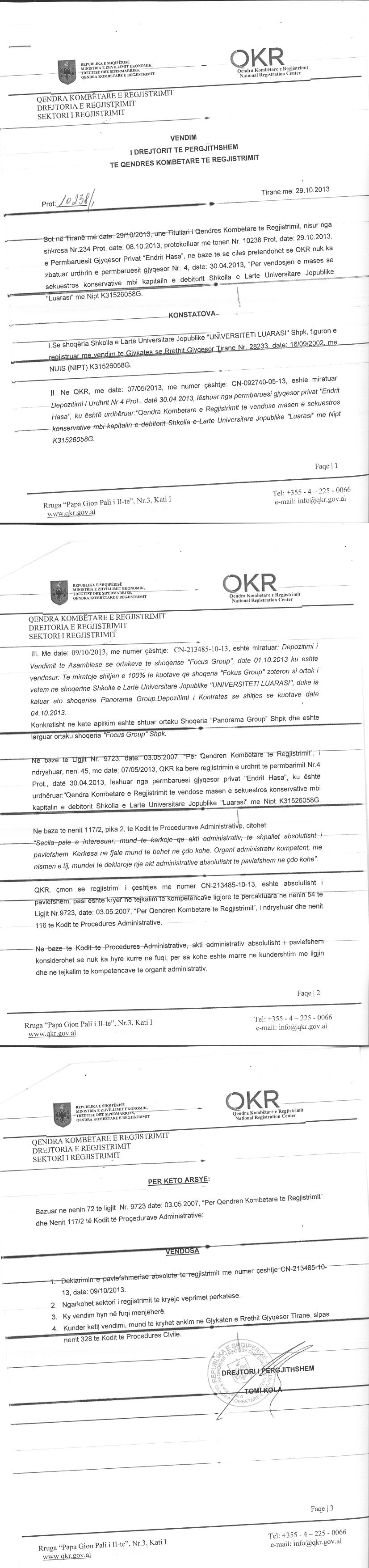 | Çështje Ligjore: | I. Me ane te Marreveshjeve Siguruese: 1. Marreveshja, date 31.10.2011, Nr.12609 Rep, Nr.4871Kol. 2. Marreveshja, date 31.01.2011, Nr.1099 Rep, Nr.383 Kol. 3. Marreveshja, date 23.04.2012, Nr.5024 Rep, Nr.1829 Kol per barret siguruese mbi pasurite e luajtshme te barredhenesit ( shoqeria FOKUS GROUP)si garanci per kredite e akorduar nga Banka Credins. Depozitimi i Vertetimeve nga Regjistri i Barreve Siguruese. II. Me date 27.02.2013, me ane te vendimit te asamblese se pergjithshme te shoqerise, u vendos : 1- Miratimi i marrjes se kredise nga shoqeria "Shkolla e Larte Universitare Jopublike UNIVERSITETI LUARASI" sh.p.k prane "Bankes Credins" sh.a 2- Miratimi per vendosjen e shoqerise "Focus Group" sh.p.k si dorezanes financiar per te garantuar marrjen e kredise nga shoqeria "Shkolla e Larte Universitare Jopublike UNIVERSITETI LUARASI" sh.p.k prane "Bankes Credins" sh.a. 3- Miratimi per krijimin e mjeteve shtese per sigurimin e ekzekutimit te detyrimeve qe rrjedhin nga marrja e kredise, duke vendosur kolateral mbi : 100 % te kuotave qe shoqeria "Focur Group" sh.p.k zoteron ne kapitalin themeltar te shoqerise "Shkolla e Larte Universitare Jopublike UNIVERSITETI LUARASI" sh.p.k, 4- Autorizimi i administratores, znj. Dajena Kumbaro, per nenshkrimin e akteve te nevojshme per kete shkak. Depozitimi i vendimit date 27.02.2013 te asamblese se pergjithshme te shoqerise "Focus Group" sh.p.k. Depozitimi i Marreveshjes Siguruese Nr. 4869/1, date 27.02.2013. III. Me date 30.04.2013, me ane te Urdhrit Nr.4 Prot., lëshuar nga permbaruesi gjyqesor privat "Endrit Hasa", u urdherua "Qendra Kombetare e Regjistrimit te vendose masen e sekuestros konservative mbi kapitalin e debitorit Shkolla e Larte Universitare Jopublike "Luarasi" me Nipt K31526058G. IV. Me date 29.10.2013, me ane te Vendimit te Drejtorit te Pergjithshem te Qendres Kombetare te Regjistrimit, Nr.10238/1 Prot, ne baze te te cilit eshte vendosur: 1.Deklarimin e pavlefshmerise absolute te regjistrimit me numer çeshtje Cn-213485-10—13, date:09.10.2013 V. Me date 29.10.2013, me ane te vendimit Nr.2248 te Gjykates se Apelit Tirane, u vendos prishja e vendimit Nr.6446 date 10.06.2013 te Gjykates se Rrethit Gjyqesor Tirane dhe dergimin e çeshtjes per rigjykim ne po ate gjykate me tjeter trup gjykues.Pezullimin e veprimeve permbarimore ne lidhje me ekzekutimin e titullit ekzekutiv (vendimit civil) Nr.4558,date 07.05.2012 te Gjykates se Rrethit Gjyqesor Tirane (ndryshuar me vendimin Nr.614,date 12.03.2013 te Gjykates se Apelit Tirane-deri ne zgjidhjen perfundimtare te çeshtjes ne gjykim. VI. Me date 04.02.2014 , me ane te vendimit Nr.398, te Gjykates Administrative te Shkalles se Pare Tirane, u vendos - Pranimi i kerkese padise. – Konstatimin e pavlefshmerise absolute te vendimit nr.10238/1, date 29.10.2013 te Drejtorit te Pergjithshem te Qendres Kombetare te Regjistrimit. – Detyrimin e pales te beje pasqyrimin ne Regjistrin Tregtar te regjistrimit te CN-213485-10-13, date 09.10.2013. VII. Me date 27.10.2014, me ane te Vendimit të ortakut të vetëm të shoqërisë, u vendos: - Rinovimin për një afat tjetër 5 vjeçar të kredisë që shoqëria Shkolla e Lartë Universitare Jopublike ''UNIVERSITETI LUARASI'' ka pranë Bankës Credins sha , duke vendosur si garanci: 1.Asetet gjendje të shoqërisë deri në datën 30.08.2014 2.Barrë Siguruese mbi 100% të kuotave që zotëon ortaku i vetëm, shoqëria "Panorama Group" sha. Depozitimi i Marrëveshjes Siguruese Nr.12920 Rep, Nr.3635 Kol, datë 19.11.2014 ndërmjet palëve shoqëria "Shkolla e Lartë Universitare Jopublike ''UNIVERSITETI LUARASI'' dhe shoqëria "PANORAMA GROUP" Barrëdhënësi dhe shoqëria "Banka Credins" sha Barrëmarrësi me objekt: Krijmi i një barre siguruese mbi pasuritë e luajtshme të Barrëdhënësve, si garanci për Kontratën e Kredisë Nr.5270 datë 11.11.2014 akorduar shoqërisë Shkolla e Lartë Universitare Jopublike ''UNIVERSITETI LUARASI'' nga Banka Credins. Shkolla e Lartë Universitare Jopublike ''UNIVERSITETI LUARASI'' dhe shoqëria "PANORAMA GROUP" vendosin barrë mbi : a. Peng asetet gjendje të shoqërisë deri në datën 30.11.2013 vlerësuar në datën 30.08.2014. b.100% të kuotave që shoqëria "Panorama Group" sha zotëron pranë Shkollës së Lartë Universitare Jopublike ''UNIVERSITETI LUARASI'' . VIII. Me date 26.3.2015, me ane te Marreveshje Siguruese Nr.4869/2, noterizuar Nr.2354 Rep., Nr.240 Kol, date 1.4.2015, ndermjet Barredhenesve : Shkolla e Larte Universitare Jopublike "Universiteti Luarasi" dhe "PANORAMA GROUP" dhe Barremarresit "BANKA CREDINS". IX. Me date 11.01.2019, me ane te Deklaratës Noteriale Nr.589Rep., Nr.181 Kol.,ndërmjet përfaqësuesëve ligjor të Bankës Credins sh.a., me anë të së cilës japin pëlqimin për heqjen e të gjitha barrave siguruese që janë vendosur në favor të Bankës Credins sh.a., mbi 100% të kuotave të kapitalit të shoqërisë tregtare “Kolegji Universitar Luarasi” sh.p.k. X.Me date 23.08.2023, me ane te shkresës Nr. 53317Prot, për “Kërkese për Vendosje të Masës së Sigurimit të Detyrimit Tatimor”, lëshuar nga Drejtoria e Përgjithshme e Tatimeve, Rajoni Qendror, është kërkuar: Vendosje të masës së sigurimit të detyrimit tatimor të tatimpaguesit shoqëria “Universiteti Luarasi “ SH.P.K., pajisur me NUIS (Nipt)- K31526058G. Vendosja e kësaj masë synon të moslejohet tjetërsimi i titujve të pronësisë dhe të drejtat pasurore që i përkasin këtij tatimpaguesit deri në shlyerjen e detyrimeve tatimore. |