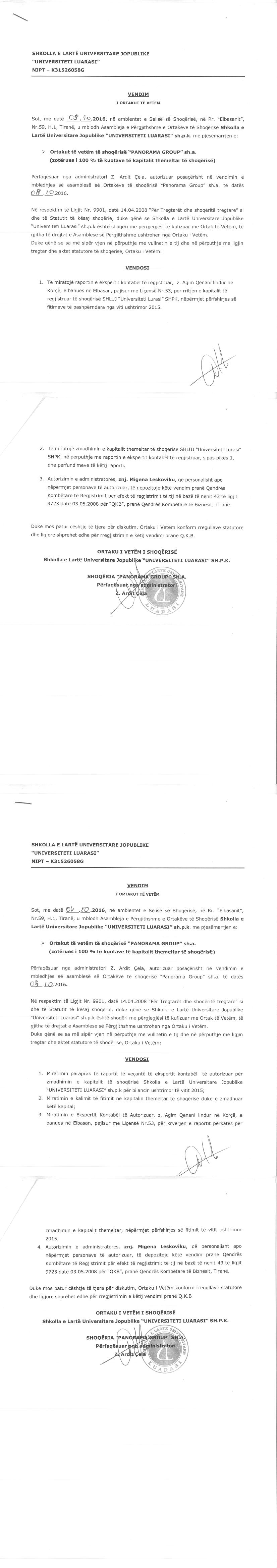 | Shoqëri Mëmë / Zotërues për këtë Subjekt: | PANORAMA GROUP një shoqëri aksionere, e themeluar më datë 02/09/2002 sipas ligjeve të Republikës së Shqipërisë, me numër identifikimi në regjistrin tregtar NIPT K22112005E, me adresë në Tirane, Rruga "Panorama", Kulla e Biznesit, 1016, Njesia Bashkiake Nr. 9 dhe me aksionere Fatmir Hysenbelliu me 50% dhe Fabiola Hysenbelliu me 50% te kuotave. Sipas të dhënave të QKB deri më date 30.06.2023 Sipas Ekstraktit Historik te Regjistrit te Pronarit përfitues date 20.07.2023, tërhequr nga QKB ne date 03.06.2024 Pronare perfitues te shoqërisë Universiteti Luarasi jane: Fabiola Hysenbelliu, shtetase shqiptare, lindur me 1978, pronare përfituese per 50% te kapitalit, pasi zotëron 50% te shoqërisë PANORAMA GROUP, e cila eshte shoqëri meme per Universiteti Luarasi me 100% te kuotave te kapitalit.Data e percaktimit si pronar perfitues eshte 19.06.2023. Fatmir Hysenbelliu, shtetas shqiptar, lindur me 1992, pronar përfitues per 50% te kapitalit, pasi zotëron 50% te shoqërisë PANORAMA GROUP, e cila eshte shoqëri meme per Universiteti Luarasi me 100% te kuotave te kapitalit.Data e percaktimit si pronar perfitues eshte 19.06.2023. |