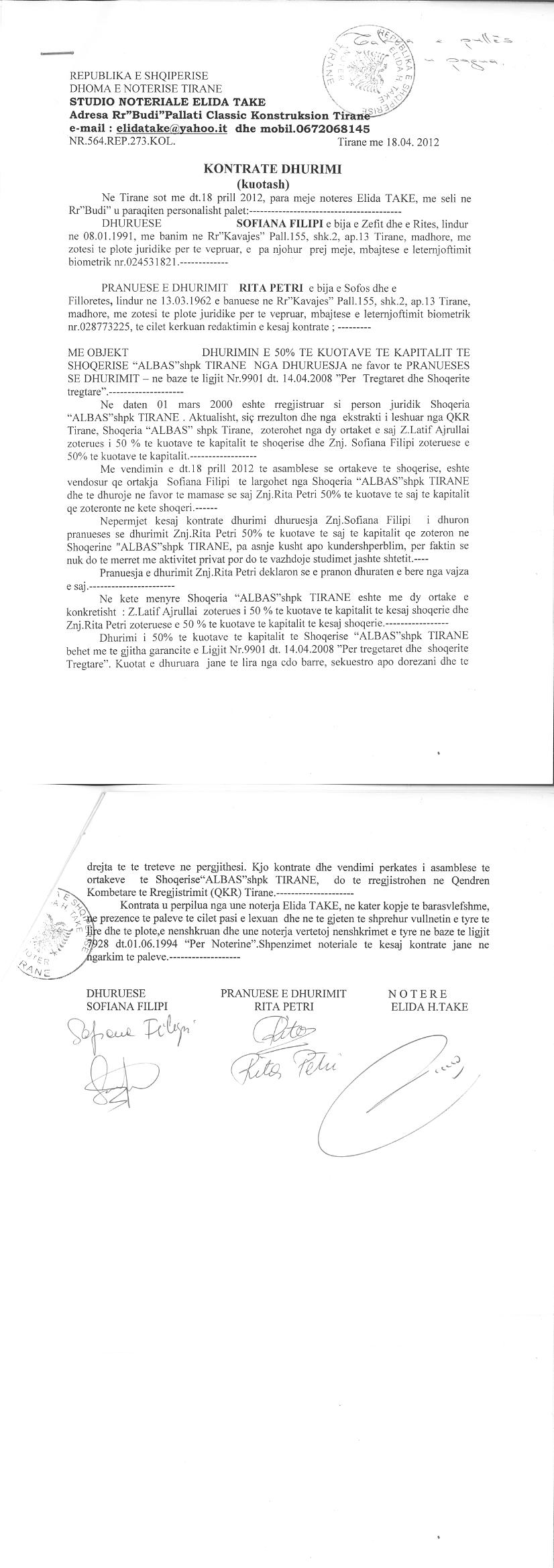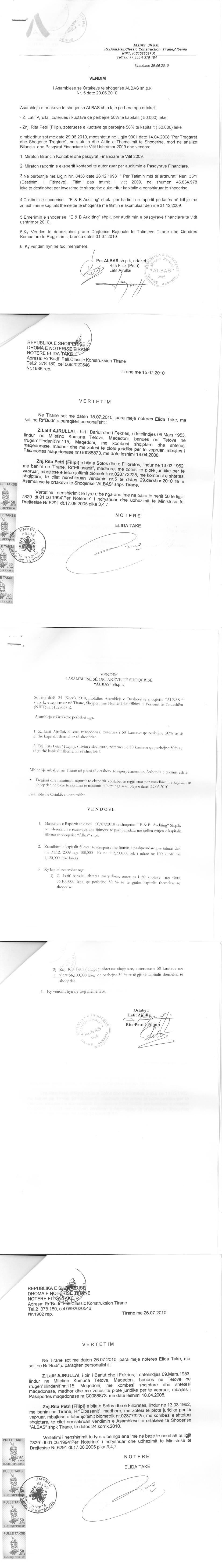 → Ekstrakt historik i regjistrit tregtar date 05.08.2021 → Akti i themelimit → Marreveshje bashkimi me perthithje date 10.01.2019 → Kontrate dhurimi kuotash date 18.04.2012 → Kontrate dhurimi kuotash date 19.01.2011 → Vendim i asamblese se ortakeve per zmadhimin e kapitalit date 24.07.2010 → Vendimi i asamblese se ortakeve per miratimin e operacionit te bashkimit date 12.01.2019 → Vendim i Gjykates Themelore ne Tetove per trashegimine ligjore, date 22.01.2021 → Vendimi i asamblese se ortakeve per zmadhimin e kapitalit date 26.07.2014 |