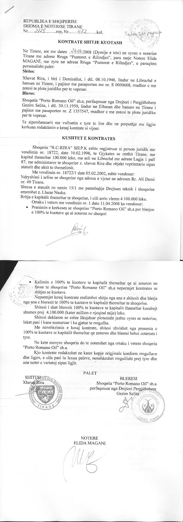 → Ekstrakt historik i regjistrit tregtar date 04.02.2023 → Statuti i shoqerise → Kontrate shitje kuotash date 24.04.2008 → Te dhenat e subjektit ne regjistrin e pronareve perfitues date 04.02.2023 |