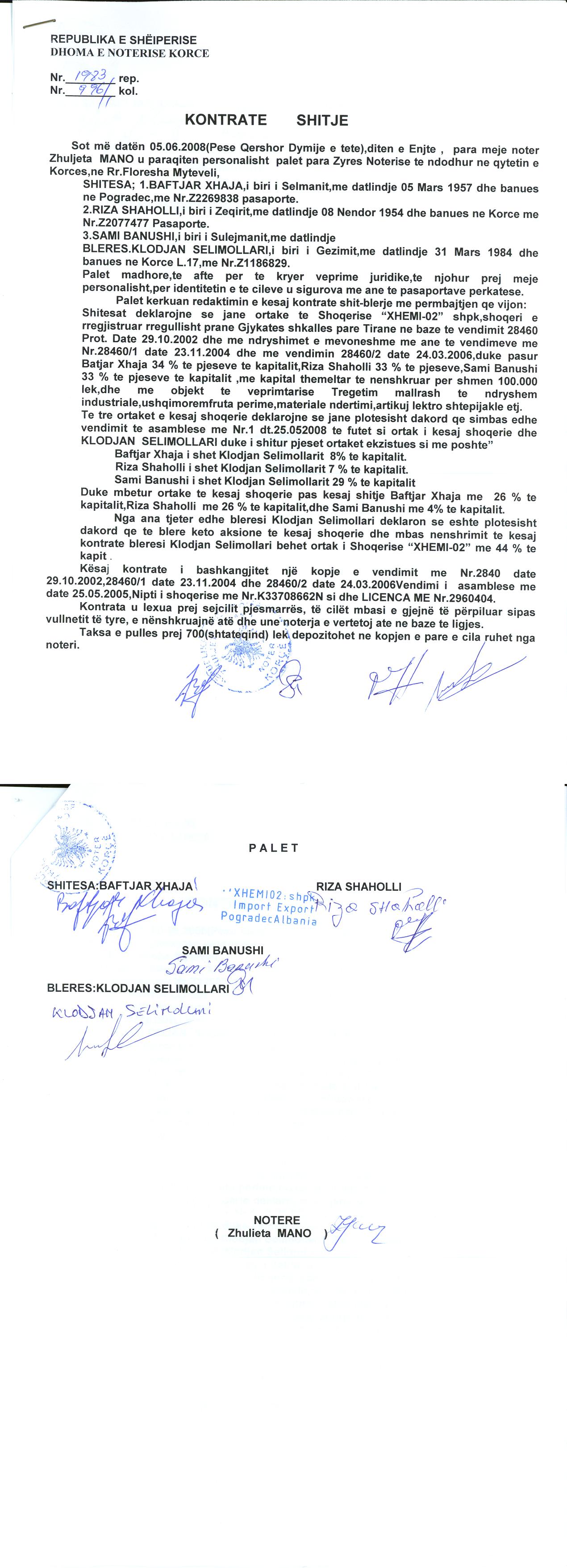 → Ekstrakt historik i regjistrit tregtar date 05.04.2022 → Kontrate transferimi kuotash date 15.12.2011 → Kontrate shitje date 05.06.2008 → Kontrate shitblerje date 07.03.2006 → Kontrate shitblerje date 10.11.2004 → Ekstrakti Historik i Regjistrit Tregtar date 28.03.2024 |