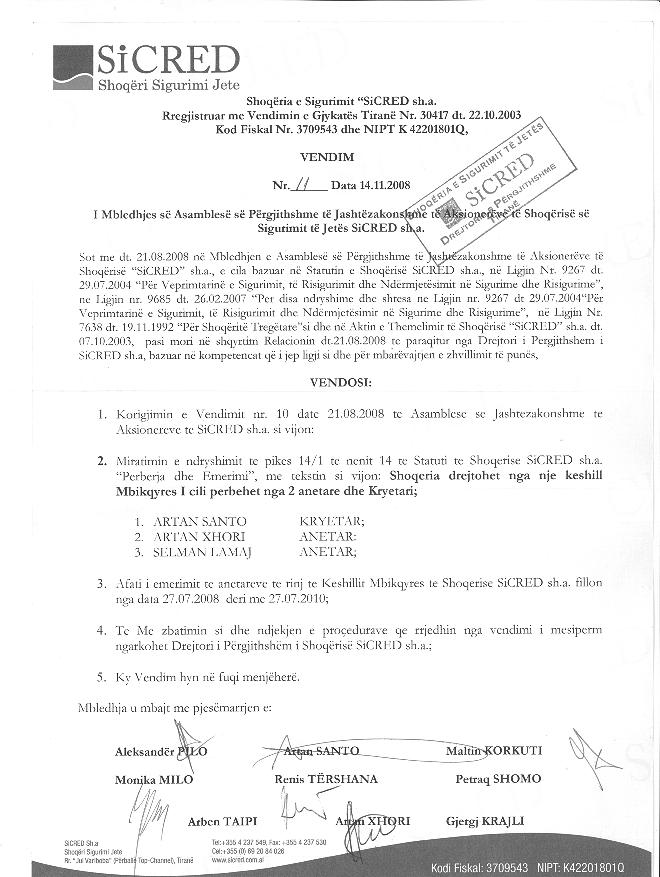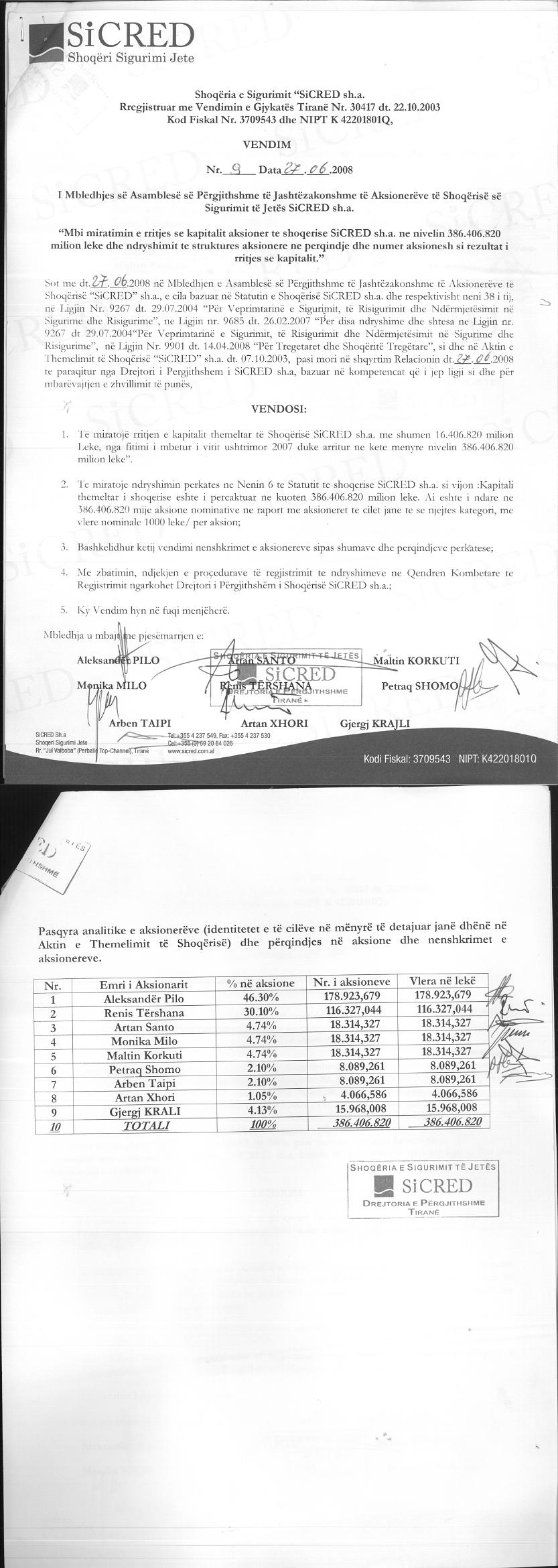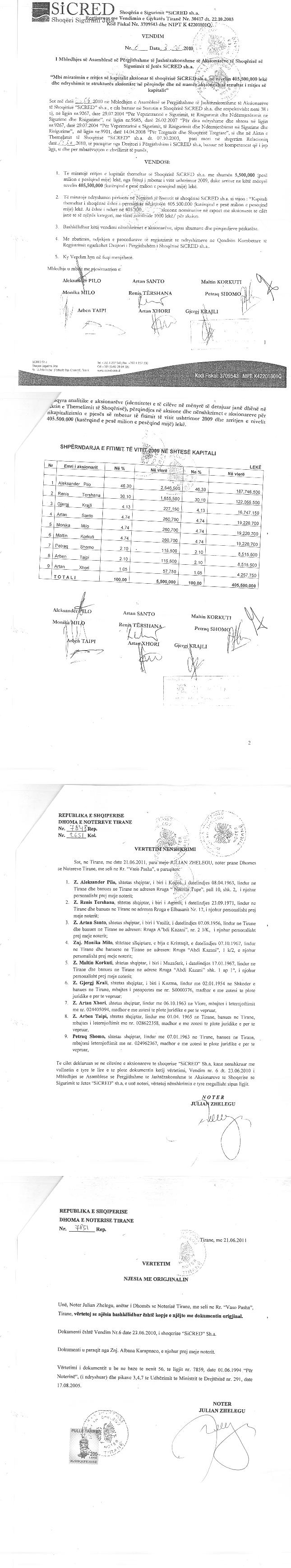 → Ekstrakt historik i regjistrit tregtar date 06.12.2021 → Akti i themelimit → Kontrate shitje aksionesh date 08.03.2005 → Vendim i asamblese se aksionareve per zmadhimin e kapitalit date 30.06.2014 → Vendimi i asamblese se aksionareve per rritjen e kapitalit date 27.06.2008 → Vendimi i asamblese se aksionareve per rritjen e kapitalit date 03.06.2010 → Vendimi i asamblese se aksionareve per zmadhimin e kapitalit date 14.11.2008 → Vendimi i asamblese se ortakeve per rritjen e kapitalit date 06.03.2018 → Vendimi i asamblese se aksionareve per shitjen e aksioneve date 29.03.2013 → Ekstrakt Historik i Regjistrit Tregtar date 08.04.2023 |