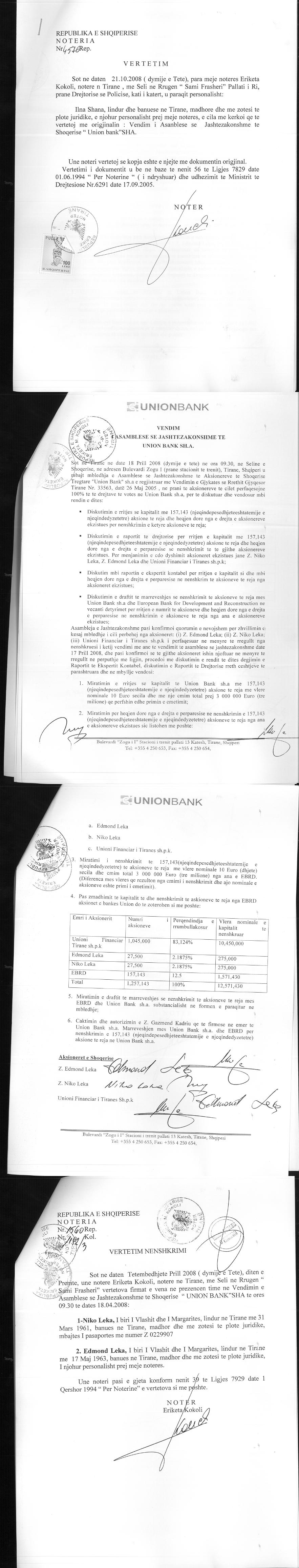 Edmond Leka, shtetas shqiptar, i datelindjes 1963, pronar perfitues prej 35.5% te kapitalit, pasi zoteron në form direkte 1.77% dhe indirekte 35% te kapitalit te shoqerise “UNIONI FINANCIAR TIRANE” – shoqëri mëmë për 96.46% te kapitalit te “UNION BANK SHA”. Data e percaktimit si pronar perfitues 17.05.2005.