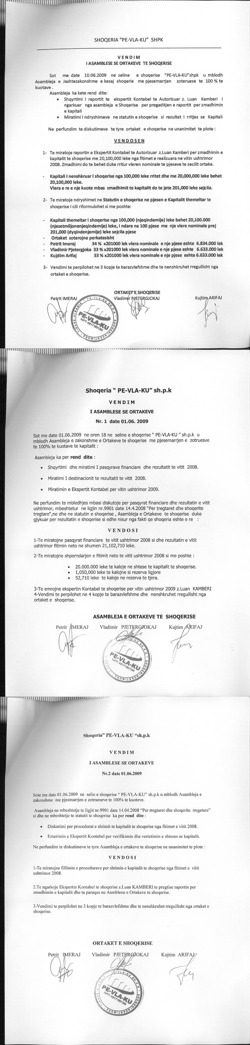 → Ekstrakt historik i regjistrit tregtar 10.08.2023 → Akti i themelimit → Kontrate shitblerje kuotash kapitali 23.06.2015 → Vendimi per zmadhimin e kapitalit 10.06.2009 → Vendimi per zmadhimin e kapitalit 10.06.2009 → Vendimi per zmadhimin e kapitalit 01.07.2010 → Vendimi per zmadhimin e kapitalit 01.07.2011 → Vendimi i asamblese se ortakeve per zvogelimin e kapitalit 20.11.2014 → Ekstrakt Historik i Regjistrit Tregtar date 06.12.2024 |