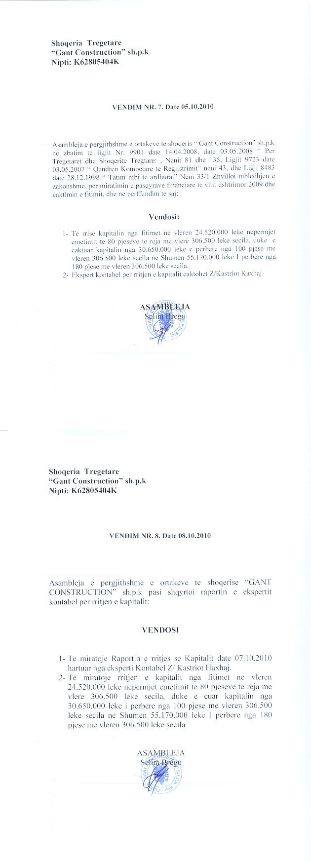 Statusi i shoqërisë ishte "Aktiv" u be "Pezulluar". II. Me datë 24.04.2014, me vendim të ortakut te vetem, u miratua aktitizimi i aktivitetit. Statusi i shoqërisë ishte "Pezulluar" u be "Aktiv". III. Me datë 20.06.2014, me anë të Urdhrit Nr. 1008 Prot., Nr.Dosje 277, "Për Vënien e Sekuestros Konservative”, lëshuar nga Shoqëria Përmbarimore Gjyqësore Private “Vako & Partners Bailiff Service” sh.p.k., drejtuar QKR, u urdhërua: “Vendosja e masës së sekuestros konservative mbi te gjitha aksionet e zotëruara nga debitori shoqëria “Gant Construction” sh.p.k., me NUIS (NIPT) K62805404K”. IV. Me datë 08.07.2014, me anë të Vendimit Nr.1159 Prot., Nr.Dosje 277, per Pushimin e Ekzekutimit lëshuar nga Shoqëria Përmbarimore Gjyqësore Private “Vako & Partners Bailiff Service” sh.p.k., drejtuar QKR, u kërkua: çbllokimi i aksioneve apo kredive te shoqerise “Gant Construction” sh.p.k., me NUIS (NIPT) K62805404K te bllokuara me ane te shkreses Nr. 1008 Prot., datë 20.06.2014. V. Me datë 24.09.2014, me anë të urdhrit Nr.9457 Prot., Nr.431 Dosje, "Për Vendosjen e Sekuestros Konservative”, lëshuar nga Shoqëria Përmbarimore “E.P.S.A”, drejtuar QKR, u urdhërua: Vendosja e sekuestros mbi kuotat që zotëron në çdo subjekt debitori shoqëria “Gant Construction” sh.p.k, me NIPT K62805404K, si dhe mbi të drejtat që rrjedhin nga zotërimi i këtyre kuotave duke ndaluar tjetërsimin ose dipsonimin e tyre si dhe ushtrimin e të drejtave që rrjedhin nga këto kuota. VI. Me datë 03.10.2014, me anë të urdhrit nr.9967 prot. 431 dosje, lëshuar nga Shoqëria Përmbarimore "E.P.S.A", u urdhërua: Heqja e sekuestros mbi kuotat që debitori, Shoqëria "Gant Construction" me NUIS (NIPT)-K62805404K, me përfaqësues Alket Metushi zotëron, e kërkuar me shkresën nr.9457 prot. dt.24.09.2014. VII. Me datë 16.03.2015, me anë të vendimit të ortakut të vetëm, u miratua Pushimi i Perkohshem i aktivitetit nga data 16.03.2015 deri pa afat. Statusi i shoqërisë ishte "Aktiv" u be "Pezulluar". VIII. Me datë 13.05.2015, me anë të Vendimit të Asamblesë së Ortakeve të shoqërisë, nr. 4/15, u vendos Aktivizimi i aktivitetit te pezulluar. Statusi i shoqërisë ishte "Pezulluar" u be "Aktiv". IX. Me datë 05.01.2016, me anë të vendimit të ortakut të vetëm, u miratua Pushimi i Perkohshem i Aktivitetit pa afat nga data 05.01.2016. Statusi i shoqërisë ishte "Aktiv" u be "Pezulluar". X. Me datë 04.03.2016, me anë të vendimit të ortakut të vetëm, u miratua Aktivizimi i Aktivitetit. Statusi i shoqërisë ishte "Pezulluar" u be "Aktiv". XI. Me datë 28.12.2016, me anë Urdhërit Nr.1997/3 Prot, datë 28.12.2016, lëshuar nga Shoqëria Përbarimore Justitia, ku është urdhëruar: " Vendosja e masës së sekuestros konservative ne aktivitetet e pales debitore, shoqeria GANT CONSTRUCTION sh.p.k pajisur me NUIS ( NIPT) - K62805404K. XII. Me datë 23.01.2217, me anë të Urdhrit Nr.177/3 Prot, protokolluar nga QKB me Nr.1423 Prot., date 31.01.2017, lëshuar nga Shoqëria Përmbarimore Justitia, u urdhërua: "Heqja e masës së sekuestros konservative ne aktivitetet e pales debitore, shoqeria GANT CONSTRUCTION sh.p.k pajisur me NUIS ( NIPT) - K62805404K. XIII. Me datë 19.04.2017, me anë të Urdhërit Nr.1061/3 Prot, lëshuar nga Shoqëria Përbarimore Justitia, u urdhërua: Vendosja e masës së sekuestros konservative ne aktivitetet e pales debitore, shoqeria GANT CONSTRUCTION sh.p.k pajisur me NUIS ( NIPT) - K62805404K. XIV. Me datë 25.07.2017, me anë të Urdhrit Nr.1811/3 Prot, protokolluar nga QKB me Nr.11602 Prot., date 27.07.2017, lëshuar nga Shoqëria Përbarimore Justitia, u urdhërua: Heqja e masës së sekuestros konservative ne aktivitetet e pales debitore, shoqeria GANT CONSTRUCTION sh.p.k pajisur me NUIS ( NIPT) - K62805404K. |