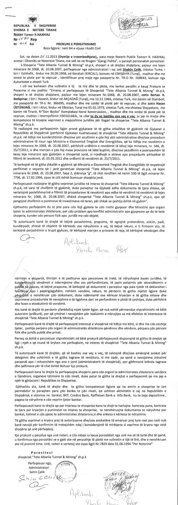→ Ekstrakt historik i regjistrit tregtar 04.02.2021 → Akti i themelimit te shoqerise → Akti i themelimit te zoteruesit TETE MADENCILIK VE MUHENDISLIK SANAYI VE TICARET A.S → Kontrate per shit-blerje kuotash dhe ndermjet ortakeve date 02.09.2016 → Prokure e pergjithshme date 25.11.2013 per emerimin e perfaqesuesit Bertan H. Berkpinar → Vendimi i asamblese se ortakeve per zmadhimin e kapitalit 30.05.2015 |