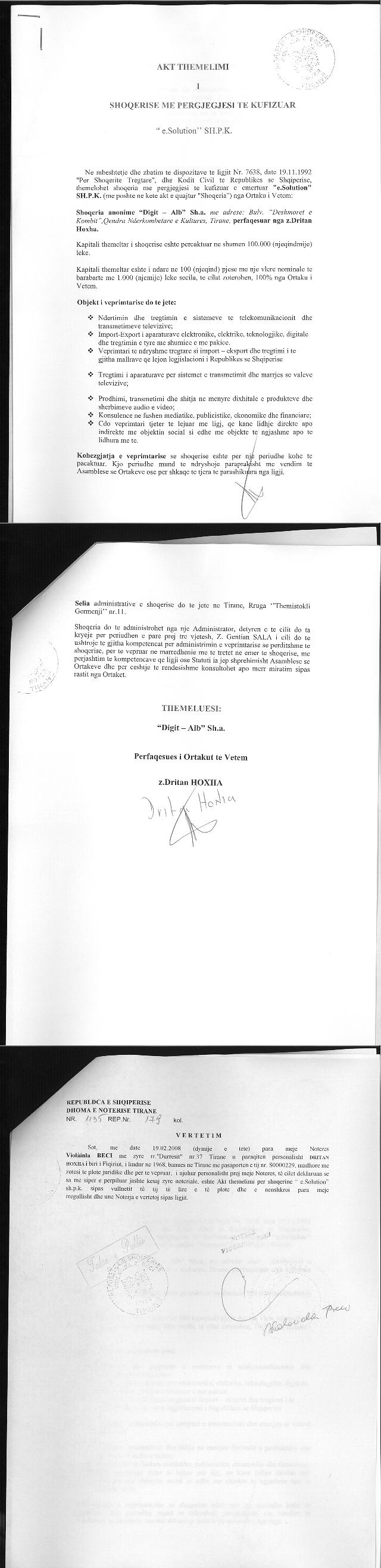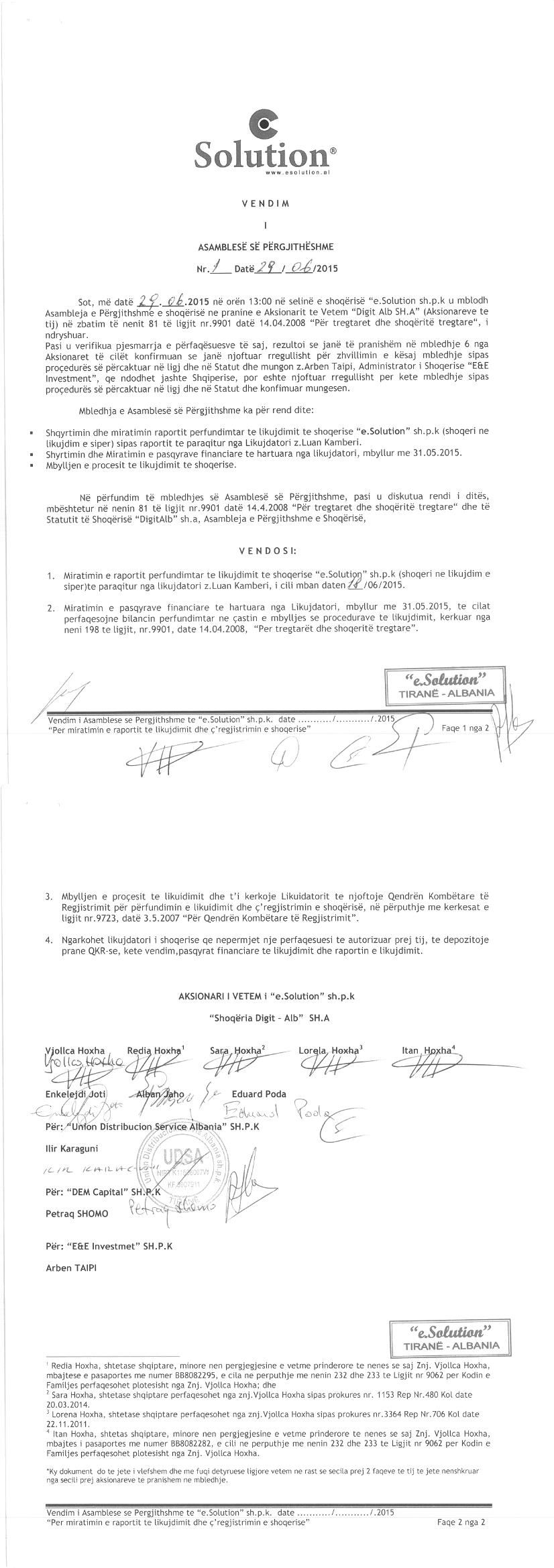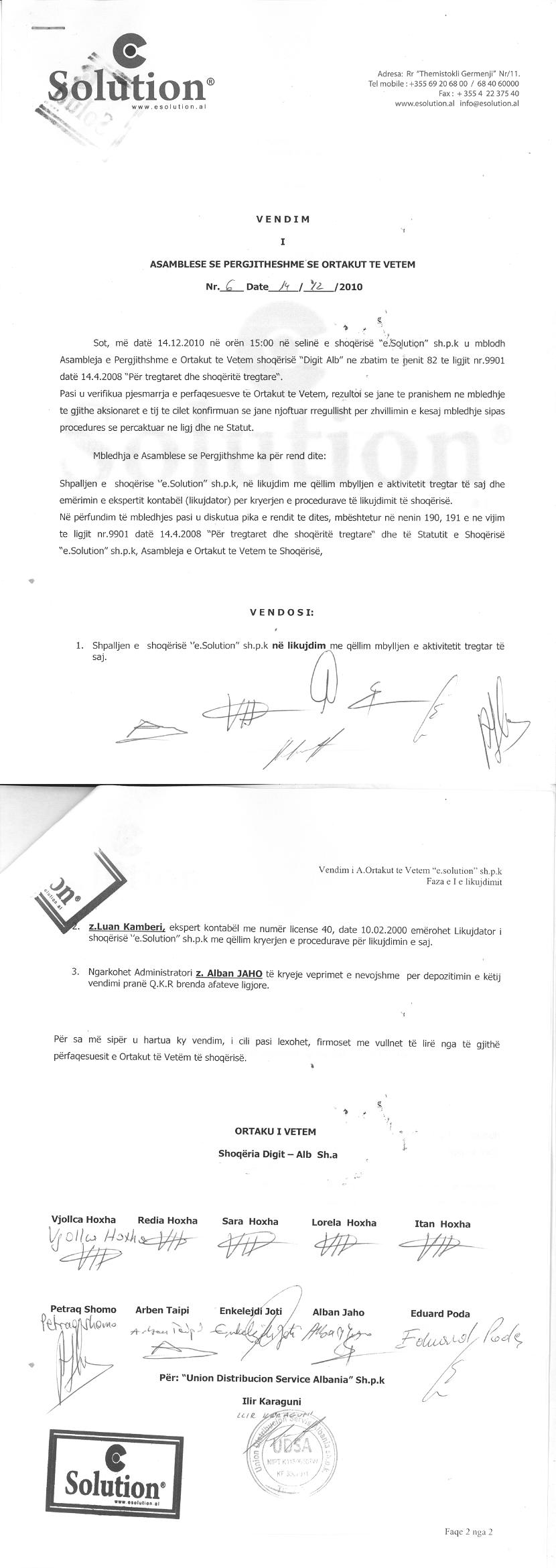| Shënime: | I. Me date 14.12.2010, me vendim te ortakut te vetem, u vendos: Shpallja e Shoqerise ne Likuidim. Statusi i Shoqerise kalon nga "Aktiv" ne "Shoqeri ne Likuidim e Siper" II. Me date 29.06.2015, me vendim te ortakut te vetem, u vendos: Çregjistrim i Shoqerise. Statusi i Shoqerise kalon nga "Shoqeri ne Likuidim e Siper" ne "Çregjistruar" |
