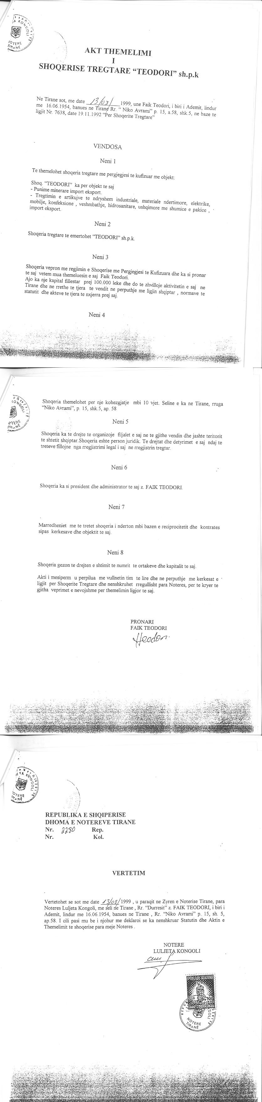 | Shoqëri e Kontrolluar nga ky Subjekt: | TEODORI 2003, nje shoqeri koncesionare me pergjegjesi te kufizuar, e themeluar me date 09/09/2003 sipas ligjeve te Republikes se Shqiperise, me numer identifikimi biznesi NIPT K42301006L, me adrese ne Tirane, Rruga Vaso Pasha, Godina 10, Hyrja 1 Apartamenti 6, Tirane, me administratore Jacques Mercier, Faik Teodori, Voisin Pierre - Richard, Lulzim Laloshi, Shefikat Ngjela. Ortaket e shoqerise jane: TEODORI (5%), Shefikat Ngjela (35%), Faik Teodori (30%), ALBANIA HYDRO INVESTMENTS HOLDING (30%) (Sipas te dhenave te QKB deri ne daten 30.03.2022) |