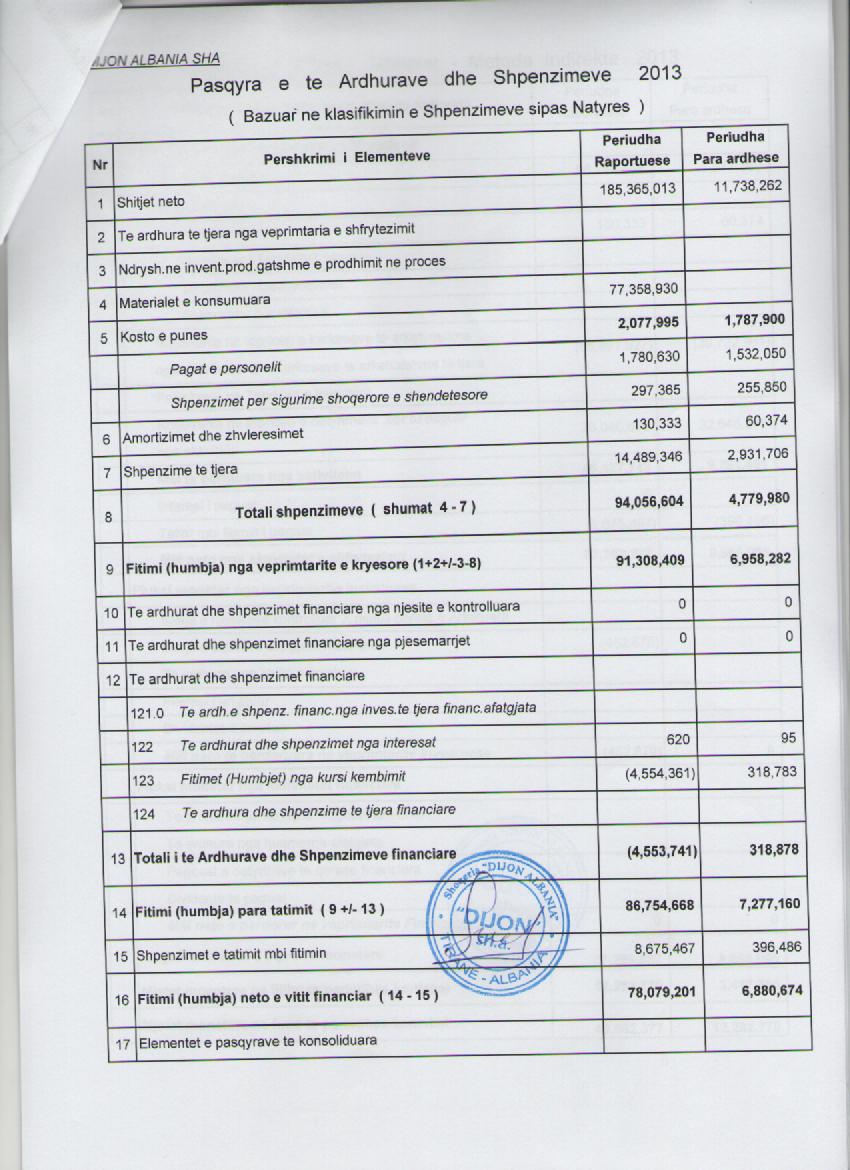 2 056 952,00 Fitimi para Tatimit(Lekë) 2022: 2 324 241,00 Fitimi para Tatimit(Lekë) 2021: 4 210 350,00 Fitimi para Tatimit(Lekë) 2020: 1 003 012,00 Fitimi para Tatimit(Lekë) 2019: 76 824,00 Fitimi para Tatimit(Lekë) 2018: -16 060 956,00 Fitimi para Tatimit(Lekë) 2017: -32 034 462,00 Fitimi para Tatimit(Lekë) 2016: -10 135 123,00 Fitimi para Tatimit(Lekë) 2015: -20 860 666,00 Fitimi para Tatimit(Lekë) 2014: -6 809 858,00 Fitimi para Tatimit(Lekë) 2013: 86 754 668,00 Fitimi para Tatimit(Lekë) 2012: 7 277 160,00 Fitimi para Tatimit(Lekë) 2011: 97 211,00 Fitimi para Tatimit(Lekë) 2010: 23 113,00 Fitimi para Tatimit(Lekë) 2009: -3 312 296,00 |