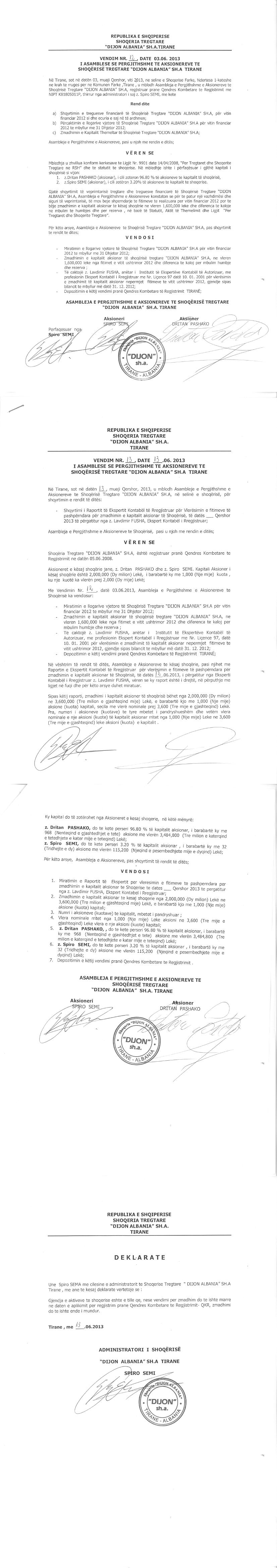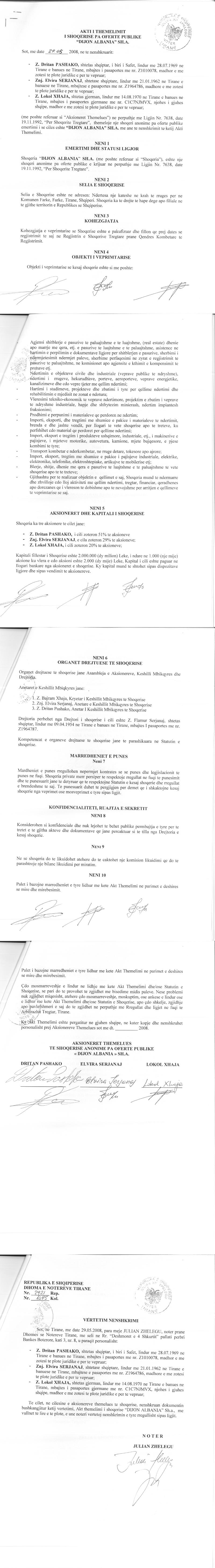 → Ekstrakt Historik i Regjistrit Tregtar date 09.04.2025 → Akt themelimi i Shoqerise → Kontratë Shitje Aksionesh datë 13.05.2009 → Marrëveshje transferimi e Pjesëve të Kapitalit datë 19.11.2010 → Kontratë Shit-Blerje Aksionesh datë 30.05.2013 → Vendim i Asamblesë së Aksionarëve për Zmadhimin e Kapitalit datë 03.06.2013 → Vendim i Asamblesë së Aksionarëve për Zmadhimin e Kapitalit datë 01.06.2015 → Akt transferimi i Aksioneve datë 27.08.2015 → Marrëveshje për Zgjidhjen e Kontratës datë 22.11.2019 → Vendim i Asamblesë së Aksionarëve për Shitjen e Kuotave nga Spiro Semi tek Ilir Hysa datë 05.10.2020 → Marrëveshje transferimi e pjesëve të kapitalit datë 10.01.2021 → Marrëveshje Siguruese Nr.13310 Rep., Nr. 3901 Kol, datë 30.12.2022 → Marrëveshje transferimi e pjesëve të kapitalit datë 22.03.2023 |