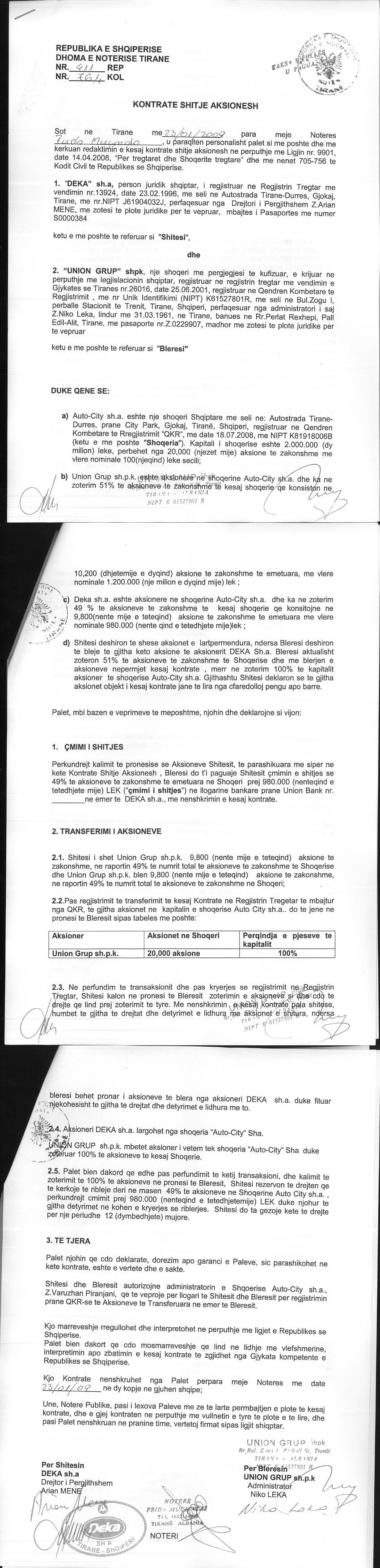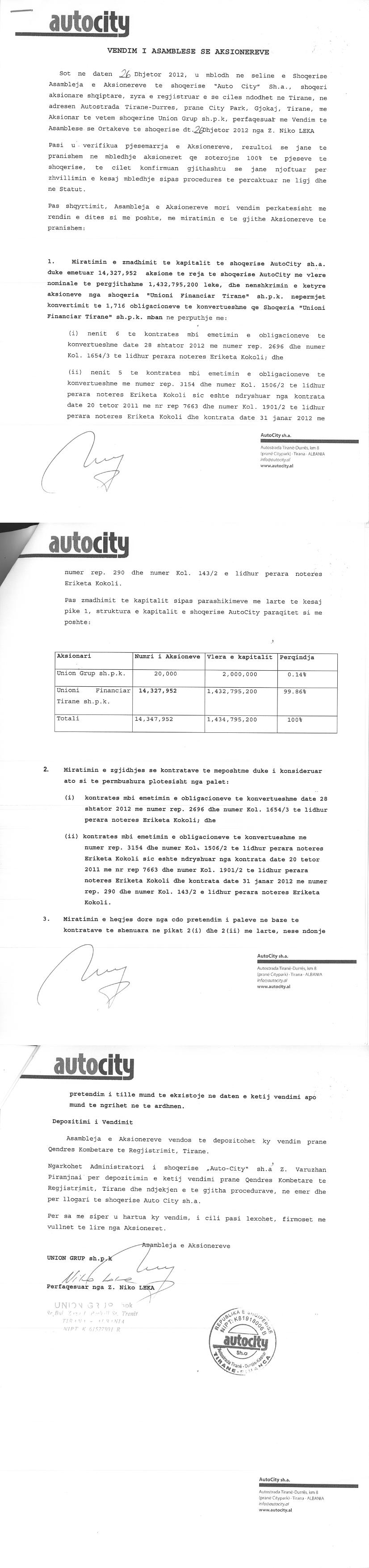 | Shoqëri Mëmë / Zotërues për këtë Subjekt: | UNION FINANCIAR TIRANE, nje shoqeri aksionare, e themeluar me date 15.02.1995 sipas ligjeve te Republikes se Shqiperise, me numer identifikimi biznesi NIPT J62424002G, me adrese ne Tirane, Rruga ''Ismail Qemali'', Nr.32, Kati 3, Kodi Postar 1019, Njësia Bashkiake Nr.5, me administrator Elton Çollaku. Aksionaret jane: Eduard Shima (10%), Gjergj Misha (10%), Varuzhan Piranjani (10%), Niko Leka (35%) dhe Edmond Leka (35%). (Sipas te dhenave te QKB deri me date 11.07.2023) Sipas Ekstraktit Historik te Regjistrit te Pronarit Perfitues, date 09.03.2021 terhequr nga QKB date 10.07.2023, Pronaret perfitues te subjektit “Auto-City”, zoterues te 25% te kapitalit e me teper, janë: Edmond Leka, shtetas shqiptar, i datelindjes 1963, pronar perfitues per 35% te kapitalit, pasi zotëron 35% të kapitalit të shoqërisë “UNION FINANCIAR TIRANE”, dhe kjo e fundit zotëron 100% të kapitalit të shoqërisë “Auto-City”. Data e percaktimit si pronar perfitues eshte 07.07.2008. Niko Leka, shtetas shqiptar, i datelindjes 1961, pronar perfitues per 35% te kapitalit, pasi zotëron 35% të kapitalit të shoqërisë “UNION FINANCIAR TIRANE”, dhe kjo e fundit zotëron 100% të kapitalit të shoqërisë “Auto-City”. Data e percaktimit si pronar perfitues eshte 07.07.2008. |