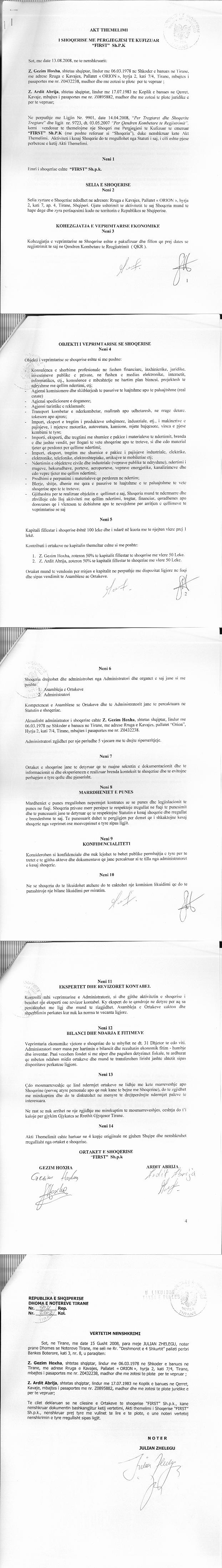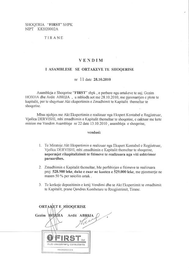 → Ekstrakt historik i regjistrit tregtar date 09.06.2022 → Akti i themelimit → Kontrate shitje e kutoave te kapitalit date 02.08.2012 → Marreveshje transferimi e pjeseve te kapitalit date 17.08.2011 → Marreveshje transferimi e pjeseve te kapitalit date 25.12.2021 → Vendim i asamblese se ortakeve per zmadhimin e kapitalit date 28.10.2010 → Vendimi i ortakut te vetem per zmadhimin e kapitalit date 20.06.2017 → Ekstrakt Historik i Regjistrit Tregtar date 03.12.2024 |
