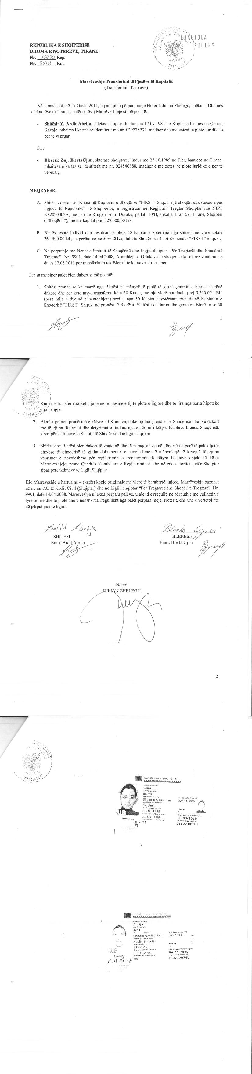 | Shoqëri e Kontrolluar nga ky Subjekt: | "B&T Signaal Traffic Solutions", shoqëri me përgjegjësi të kufizuar, e themeluar më datë 06/09/2013, sipas ligjeve të Republikës së Shqipërisë, me numër identifikimi në regjistrin tregtar NIPT L32109026N, me adresë aktuale në Tirane Rruga Dritan Hoxha, Numer 33, Postal Code 1004, dhe me administrator Gëzim Hoxha. “FIRST” shpk zotëron 26% të kapitalit të shoqërisë. (Sipas të dhënave të QKB deri më datë 03.12.2024) |