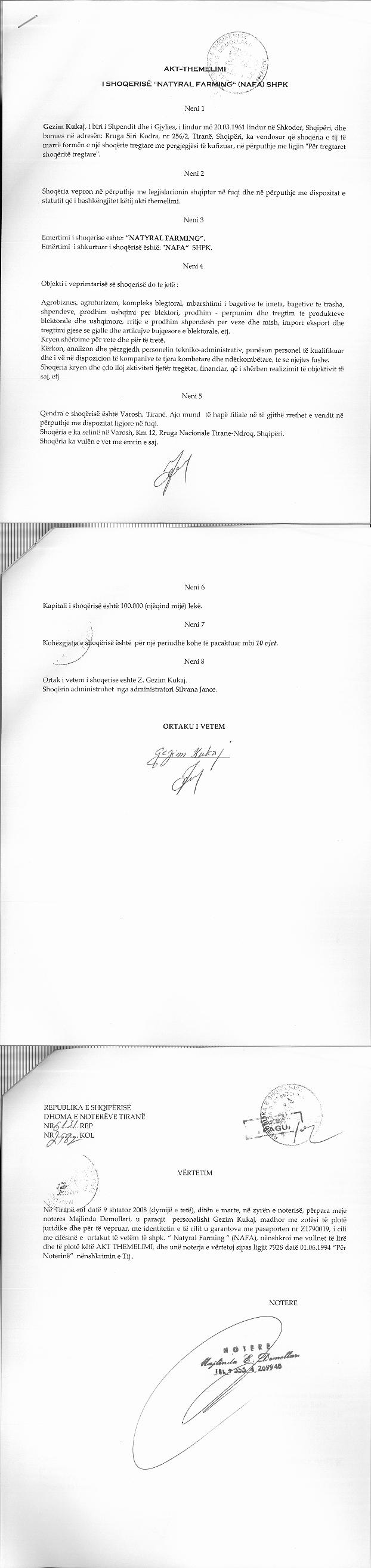 | Objekti i Veprimtarisë: | Agrobiznes, Kompleks Blegtoral, mbareshtim i gjese se gjalle. Import-Eksport dhe tregtim i gjese se gjalle dhe artikujve bujqesore e blegtorale.Prodhim-Perpunim dhe tregtim te produkteve ushqimore dhe blegtorale.Rritje dhe prodhim shpendesh per veze dhe mish, prodhim dhe tregtim ushqimi per blegtorine si dhe cdo aktivitet tjeter tregtar dhe financiar qe i sherben realizimit te objetivit te saj, etj.Bar Restorant dhe Katering.Zhvillim te Akua-Kultures (Peshk te llojeve te ndryshme). Import - eksport dhe tregtim te mallrave te akcizes. Import-Eksport te produkteve ushqimore me origjine shtazore. |