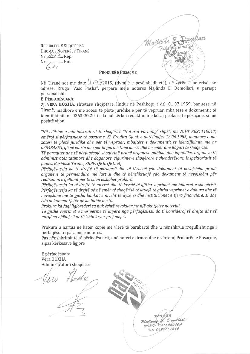 | Çështje Ligjore: | I. Me date 14/05/2015, me ane te depozitimit te Prokures se Posaçme Nr.1650 Rep., Nr.671 Kol., date 11.5.2015, me ane te se ciles e perfaqesuara Zj. Vera Hoxha, ne cilesine e administratorit te shoqerise "Natural Farming" shpk, me NIPT K82111001T, emeron si perfaqesuese te posaçme zj. Erodita Gjoni, qe ne emer dhe per llogari te saj dhe si edhe ne emer dhe llogari te shoqerise: Te paraqitet dhe te perfaqesoje shoqerine prane organeve publike dhe jopublike, organeve te administrates tatimore dhe doganore, sigurimeve shoqerore e shendetesore, Inspektoriatit te punes, Bashkise Tirane, ZRPP, QKR, QKL, etj. Perfaqesuesja ka te drejte te paraqese dhe te terheqe çdo dokument te nevojshme prane