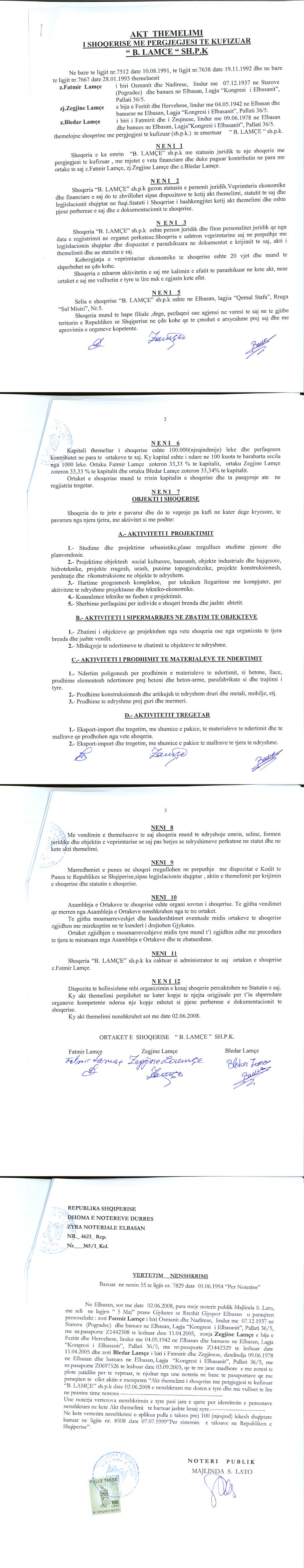 → Ekstrakt Historik i Regjistrit Tregtar date 05.10.2023 → Akt themelimi i Shoqerise → Dëshmi trashëgimie Ligjore datë 14.11.2013 → Kontratë Shitblerje datë 21.07.2015 |